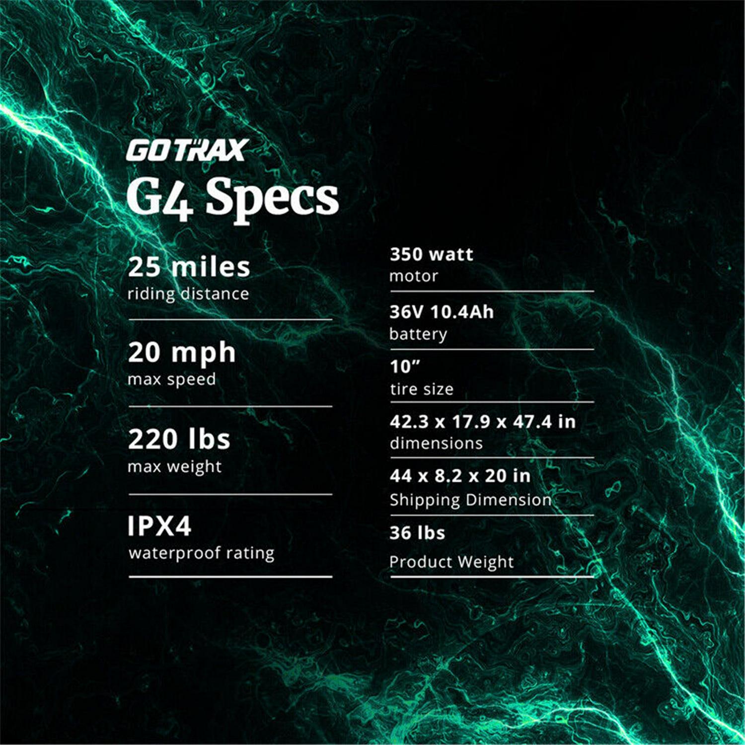 – ALL NEW G-SERIES – The G4 is part of the new high-performance series of electric scooters by GOTRAX. Bigger Motors, longer distance, more features, and an all-new body design.
