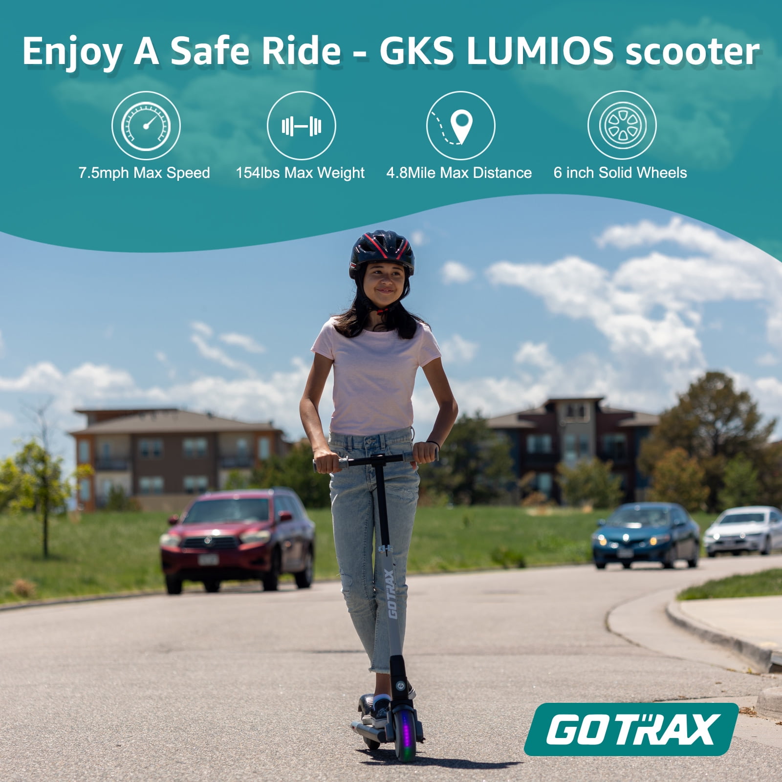 Introducing the GOTRAX GKS Lumios Electric Scooter for Kid Ages 6-12, the perfect way for your kids to have fun while being environmentally friendly! With its UL safety certified 150W motor, 6″ solid wheels, and top speed of 7.5mph, your kids will have a blast riding around the neighborhood. The eco-friendly Li-Battery ensures a long-lasting ride, while the aircraft-grade metal and VO fire retardant deck provide durability and safety. The scooter is easy for your child to master, with a gravity sensor for slowing down and a rear brake for a safe stop. Plus, the adjustable height means your child can enjoy it for years to come. And with its new LED luminous front wheel design, your child will be the center of attention at night while riding safely with the LED lights. Get your child the GOTRAX GKS Lumios Kids Electric Scooter today! Name : Gotrax Gks Lumios Electric kick Scooter Color : Gray/Blue/Green/Pink User Age : 6-12 years old Special Feature : Adjustable Handlebar Height Weight Limit : 154 Pounds Item Dimensions LxWxH : 33 x 15 x 32 inches Wheels : 6″ Solid Tires Distance : 6.25 Miles Max Speed : 7.5 mph Motor : 150 Watt Charging Time : 5 hours Frame Material : Aluminum Item Weight : 18.7 Pounds Handle Height : 37 Inches Wheel Type : Solid Brake Style : Rear Braking