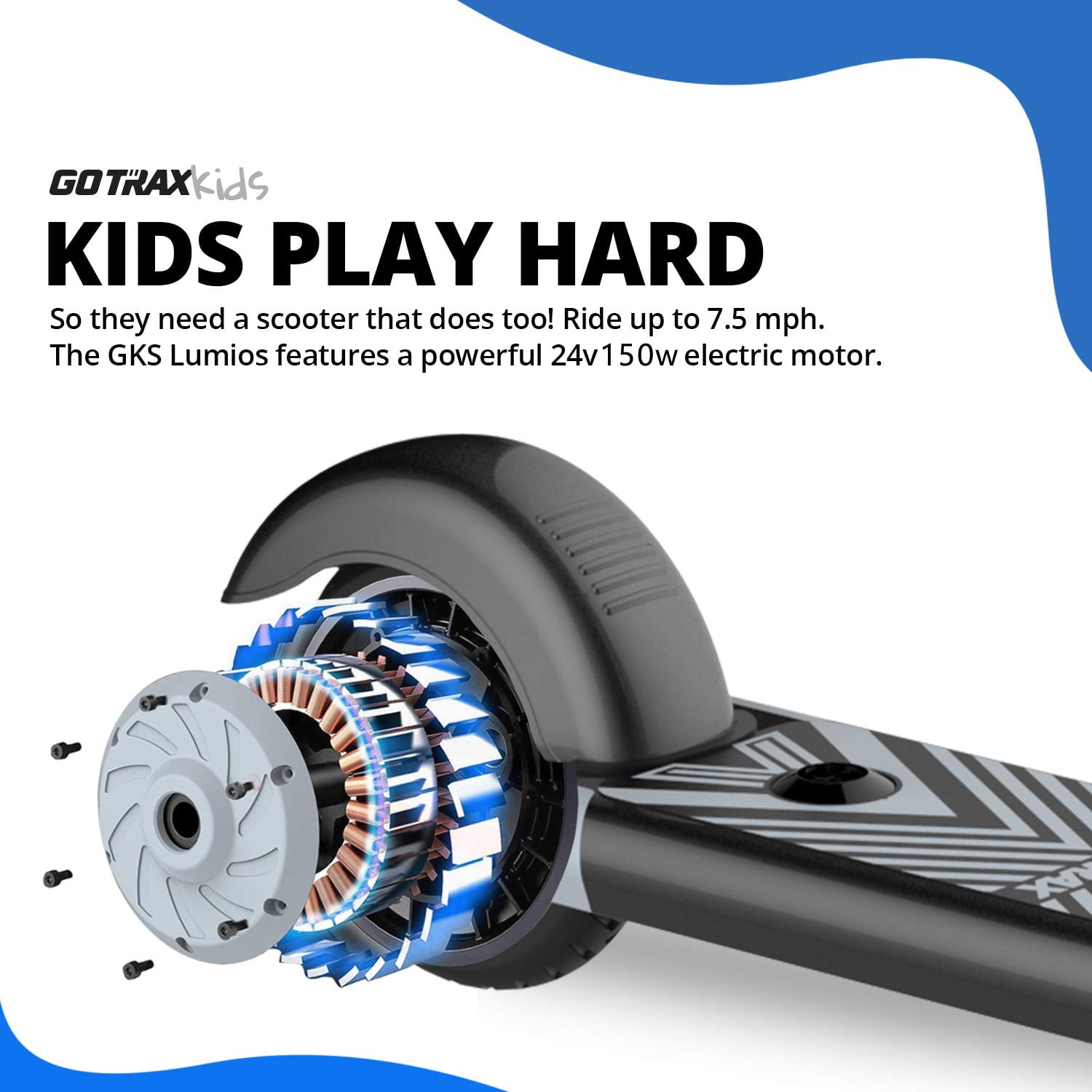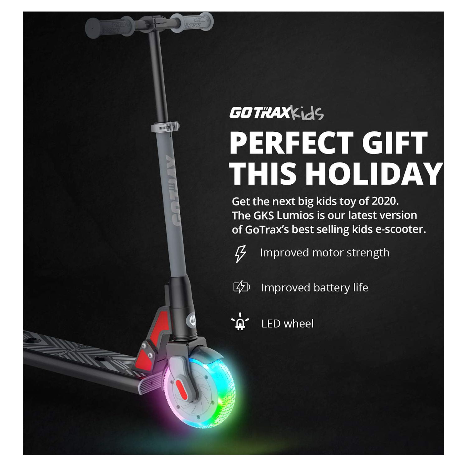 Kids Kick Scooter – The Gotrax GKS LUMIOS is the brilliant e scooter for kids. Attracted by the vibrant color and LED wheel it’s sure to be their favorite toys. The light weight frame is made from Aircraft-Grade Aluminum, features a fire retardant deck. FANTASTIC LED WHEEL – Your kids will be thrilled when they see their new glowing electric scooter. The front wheel now has a built in neon led that shines bright and stands out. Upgraded Battery and Motor – More time to play means more fun. Ride up to 6.25 miles per charge using the new 20% larger battery. The GKS LUMIOS features a 150W motor that reaches a safe max speed of 7.5mph. Adjustable Handlebars – Now the GKS LUMIOS can grow with your child so they can enjoy it for years to come. Easily adjust the handle bars to heights between 32.5″- 37″. Bringing Family Together – The GKS LUMIOS kick scooter is perfect for kids ages 6-12 up to 154lbs. The Assembly is simple and can be done together. Quickly install the few screws and your scooter is ready to go! Supervision while riding is recommended. 【24-hour Response Customer Service】GOTRAX offers 24-hour response service which will make sure to solve all your needs. Whether you want to ask a purchasing question or resolve a product issue, feel free to let us know at any time!