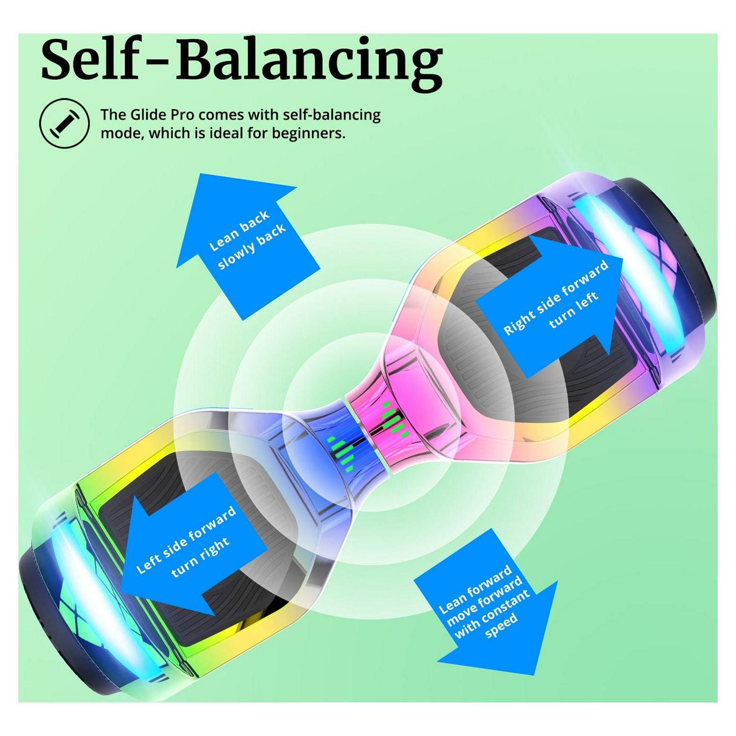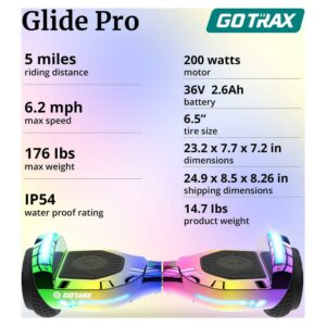 The Glide Pro Hoverboard features cool led-lit wheels in the shape of the GOTRAX logo that lights up the night. Fender lights and headlights ensure your driving safety at night and stand out. The 6.5inch size tire creates a smoother ride and makes the hoverboard easier to . This hoverboard isn’t just for kids. It can be a thoughtful and unique gift for your friends and family. It’s a fun surprise and can carry riders of all sizes up to 176 lbs.equipped with a self-balancing control system to go straight, make a turn, and rotate for 360 degrees locally, and is operated at will GOTRAX hoverboards get their popularity from innovative designs, and reliable quality. GOTRAX hoverboards floor is affixed with a unique UL certification label.
