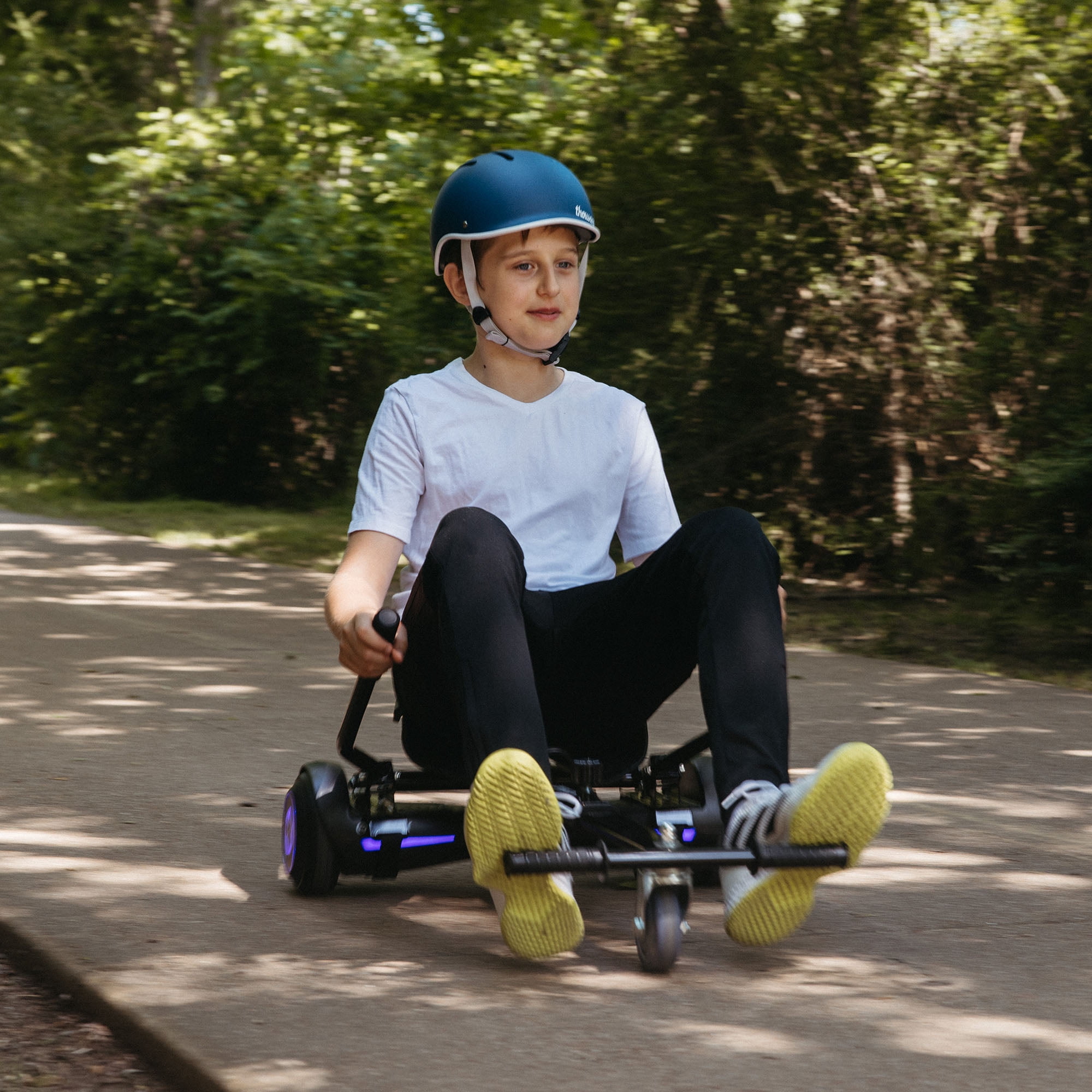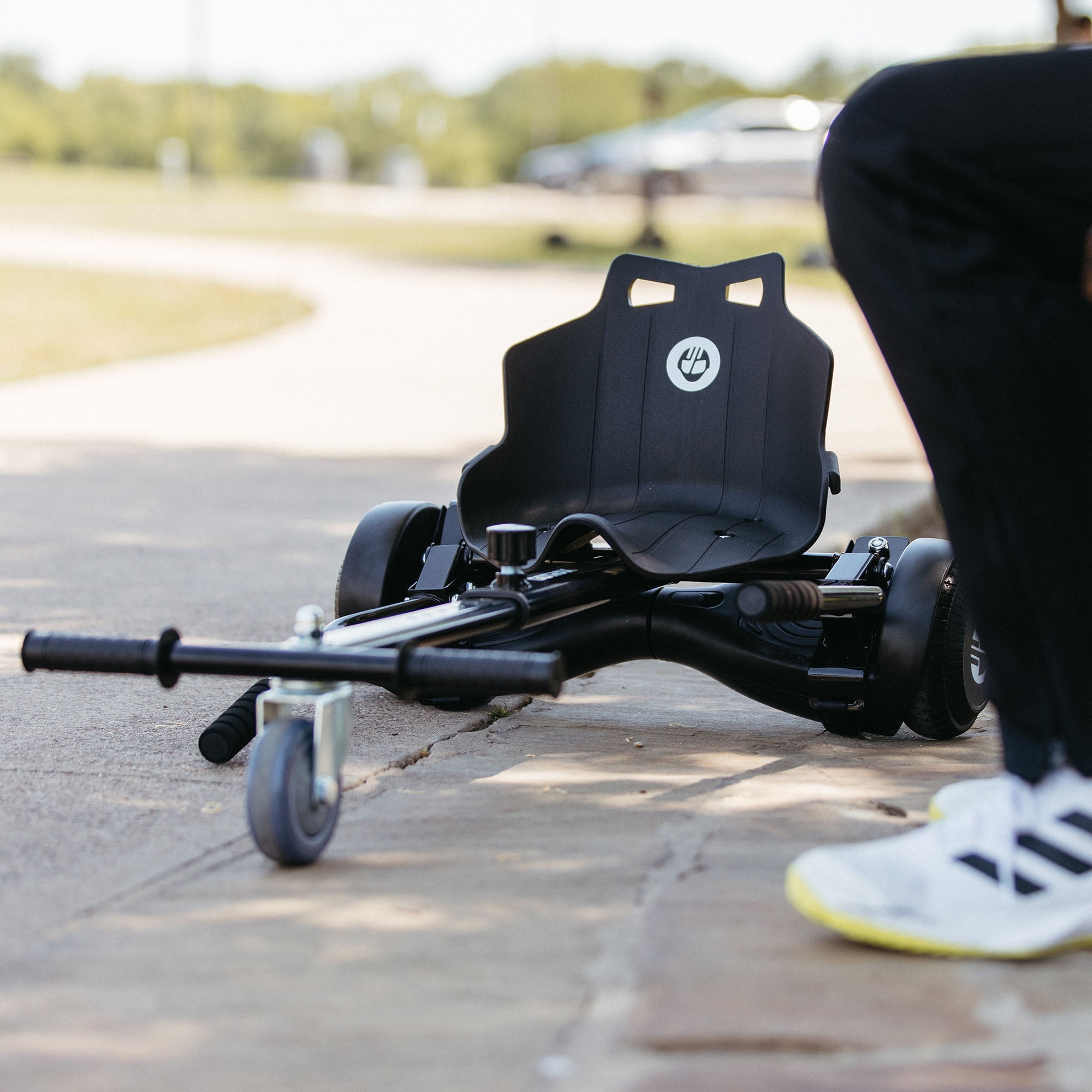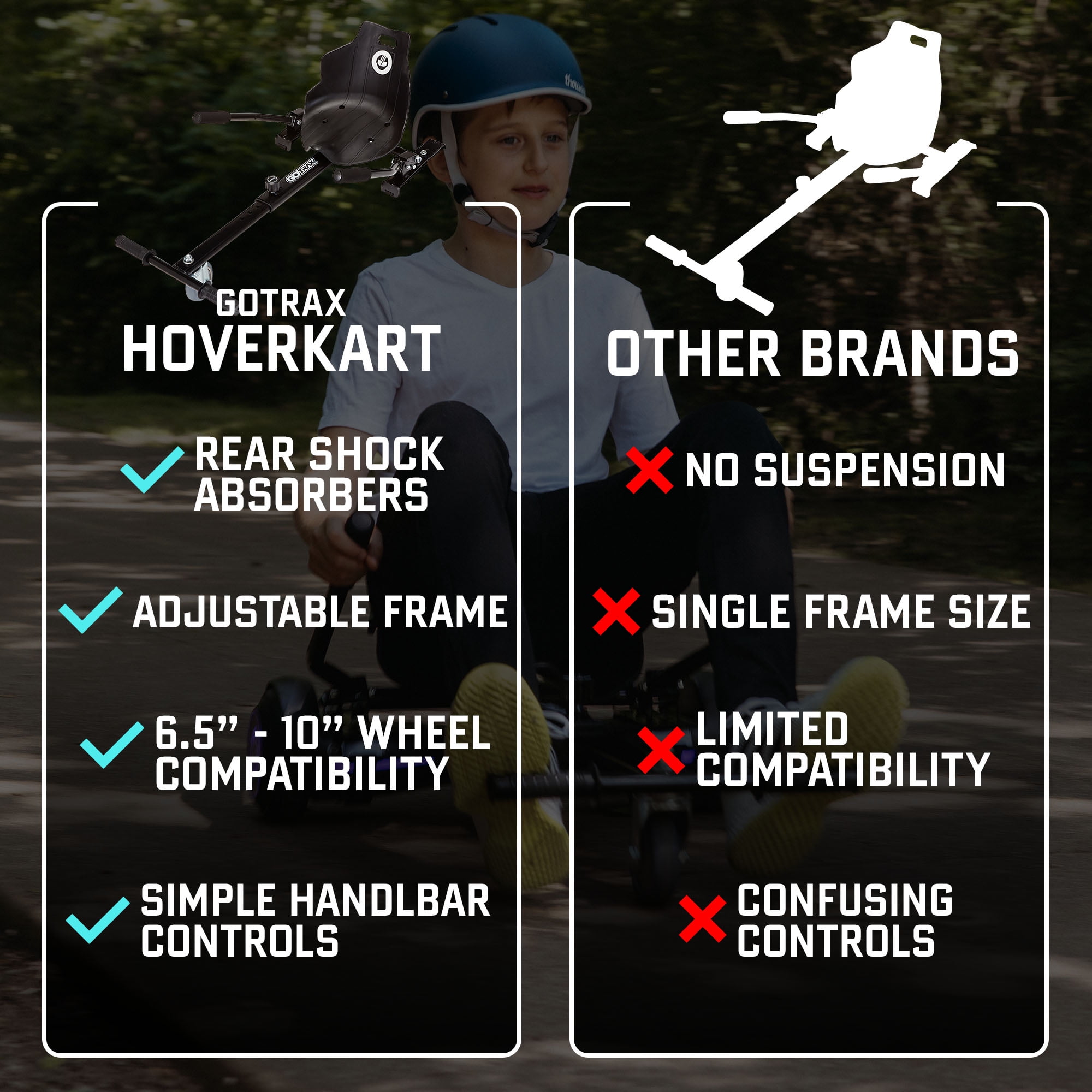 HOVERBOARD GO KART – Easily convert your hoverboard into a go-kart with Gotrax HoverflyKart. Equipped with an ergonomic seat would be easier to keep balance and ride stable. It’s an all new way to have fun with your favorite hoverboard. Note: Hoverboard not included, If you have any questions or need help, please contact us without hesitation, we will handle it within 24 hours. WIDELY COMPATIBLE – HoverflyKart works with Gotrax EDGE, NOVA, NOVA PRO, GLIDE, E4, E5, PULSE series, and most other hoverboards. The adjustable nylon straps can fit the most common wheel sizes from 6.5″ to 10″, and the hoverboard pedals should be larger than 16.93″. Max load is determined by your self-balancing scooter. ADJUSTABLE FRAME – Frame length can be adjusted from 30.70″ to 38.58″, suitable for all heights and a wide range of ages riders. Easily unscrew the locking mechanism and adjust the frame to increase or decrease the amount of legroom to find the most suitable posture for gliding. EASY-TO-USE HAND CONTROLS – The handlebar steering system allows start, stop and perform 360° turns. Anti-slip rubber handlebar and foot grip, make you achieve easily control, comfort, safety and ease riding is what everyone will enjoy. STURDY & EASY ASSEMBLY – The HoverflyKart is made of aluminum frame will be more sturdy. Turning your hoverboard into a go-kart only requires less than 10 minutes of assembly. It’s a great gift for anyone who enjoys their hoverboard. 【24-hour Response Customer Service】GOTRAX offers 24-hour response service which will make sure to solve all your needs. Whether you want to ask a purchasing question or resolve a product issue, feel free to let us know at any time!