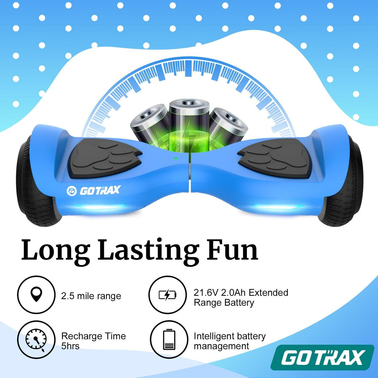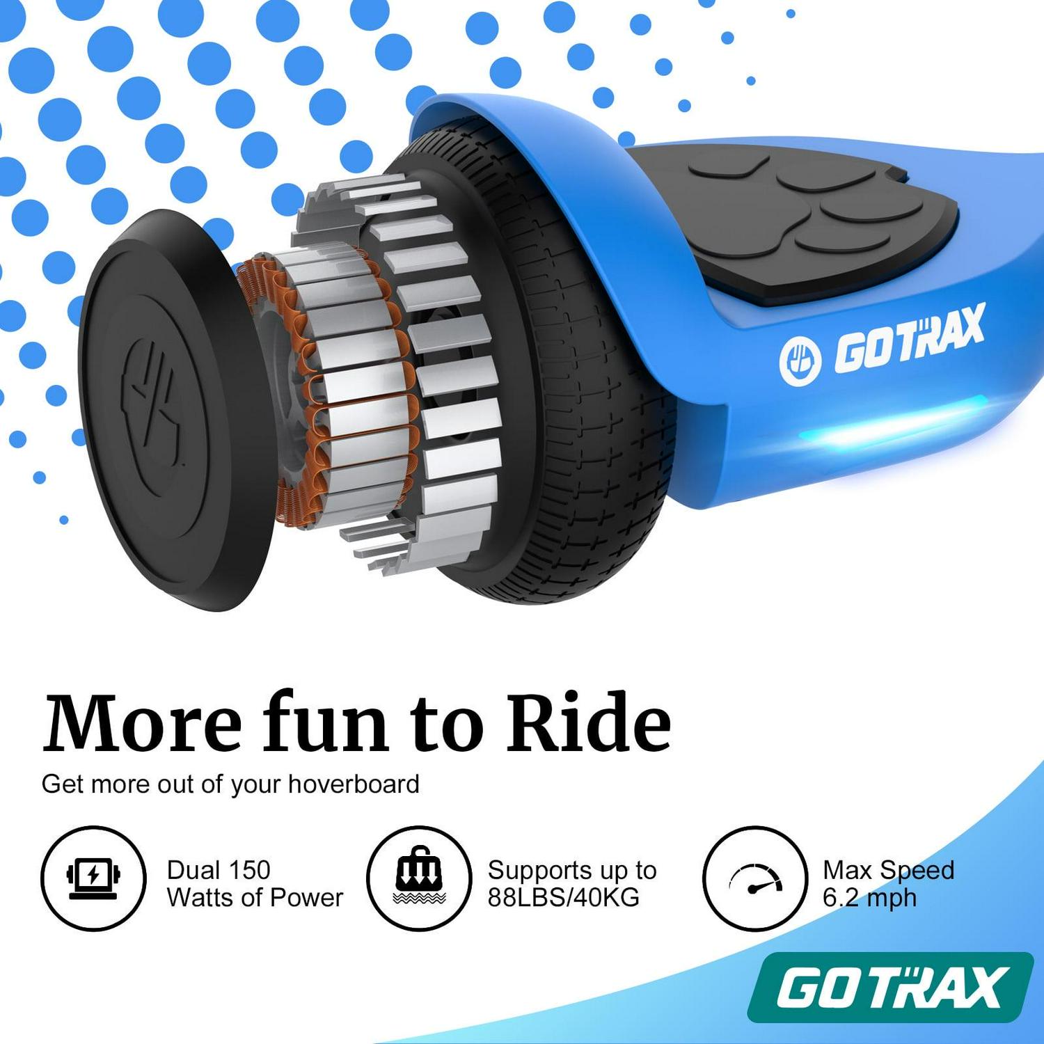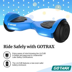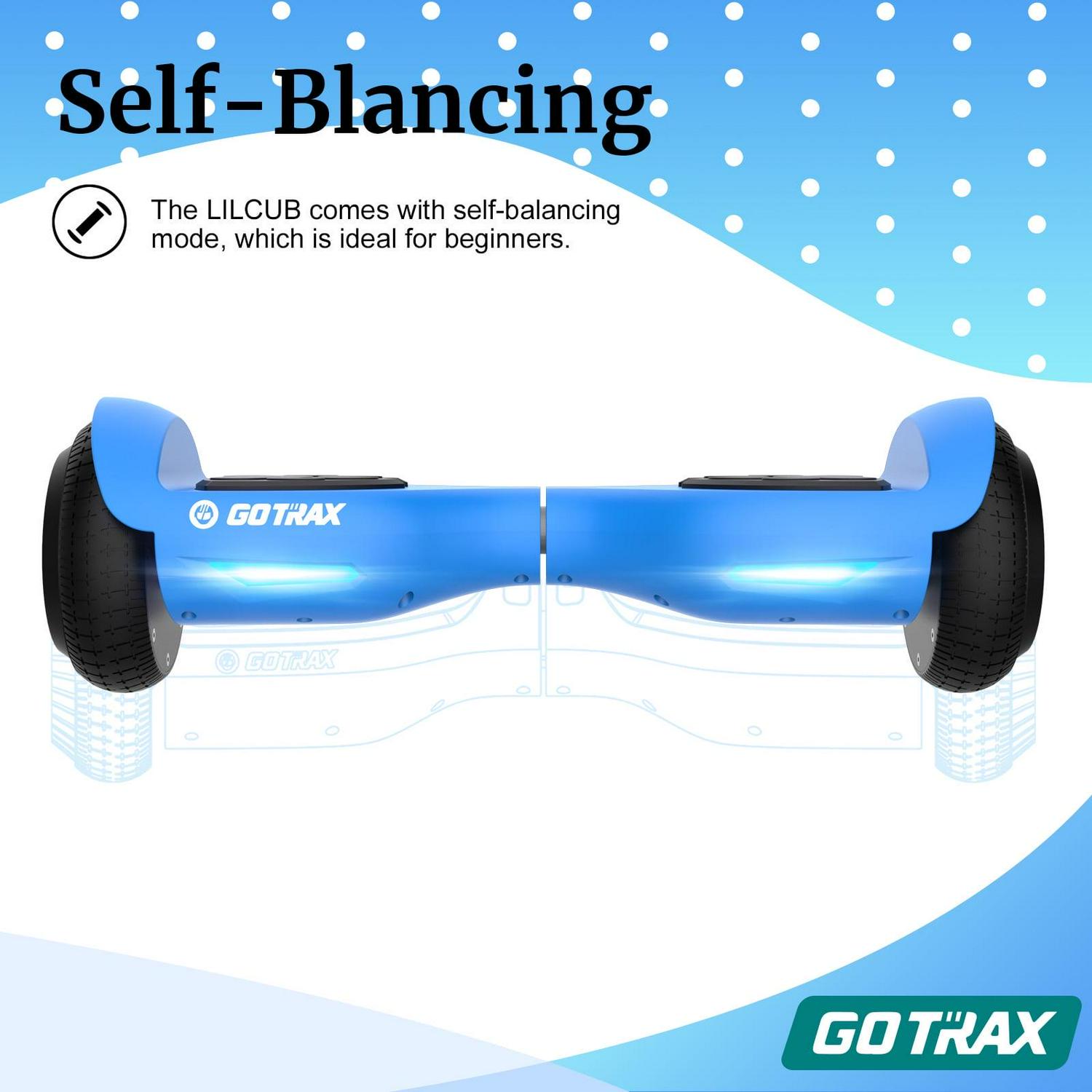 GOTRAX Lil Cub Hoverboard Designed for Young Riders Looking to Make Their First Strides on a Hoverboard Blue.Designed for Kids,Equipped with family-favorite safety features: Non-slip rubber tires, bearpaw pedal and night driving lights. Kid friendly motor: With dual 150W motor, capped at a safe 6.2 miles per hour for max performance.