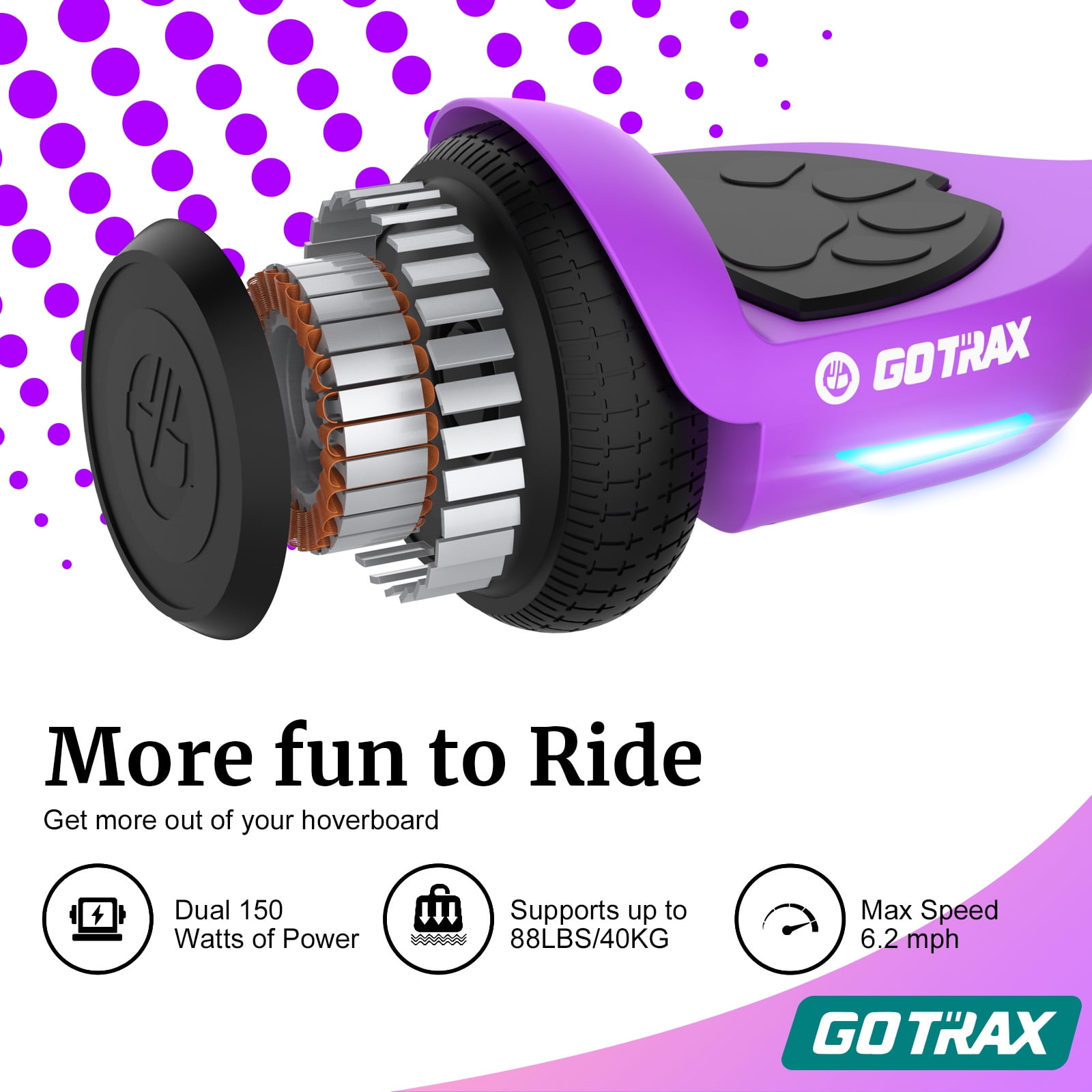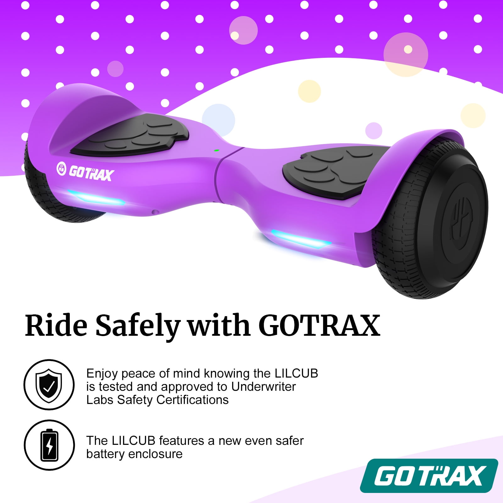 GOTRAX Lil Cub Hoverboard Designed for Young Riders Looking to Make Their First Strides on a Hoverboard.Designed for Kids,Equipped with family-favorite safety features: Non-slip rubber tires, bearpaw pedal and night driving lights. Kid friendly motor: With dual 150W motor, capped at a safe 6.2 miles per hour for max performance. Hoverboard Fun with Family, Bringing the Family Together, Now even the smallest of riders can enjoy hoverboard with the Lil’ Cub.LED Headlight, Lightweight Easy to Carry, Ideal and Affordable Gifts for Kids. 6.5″ tires is easy to ride and master Featuring self-balancing mode Only 11.33lbs is one of the lightest for easy carry Support up to 88lbs Safely speed up to 6.2mph 2.5 miles max range per charge UL2272 safety certification Product Dimensions: 21 x 6.6 x 6.37 inches”