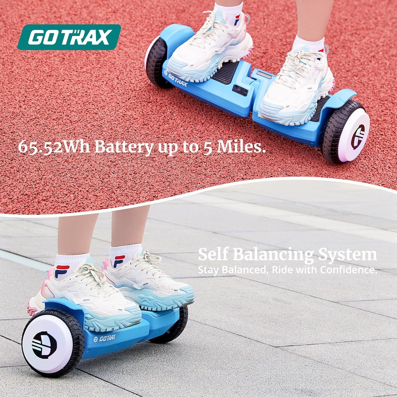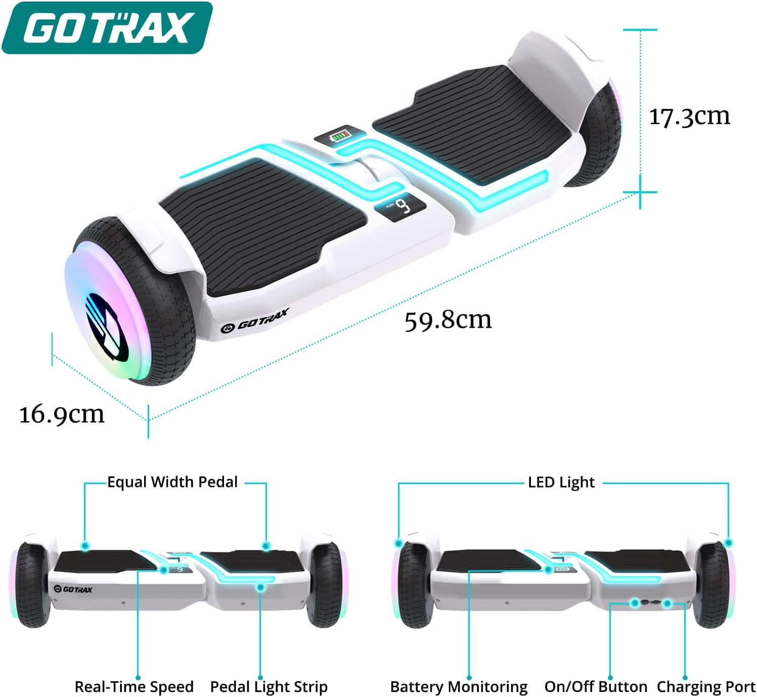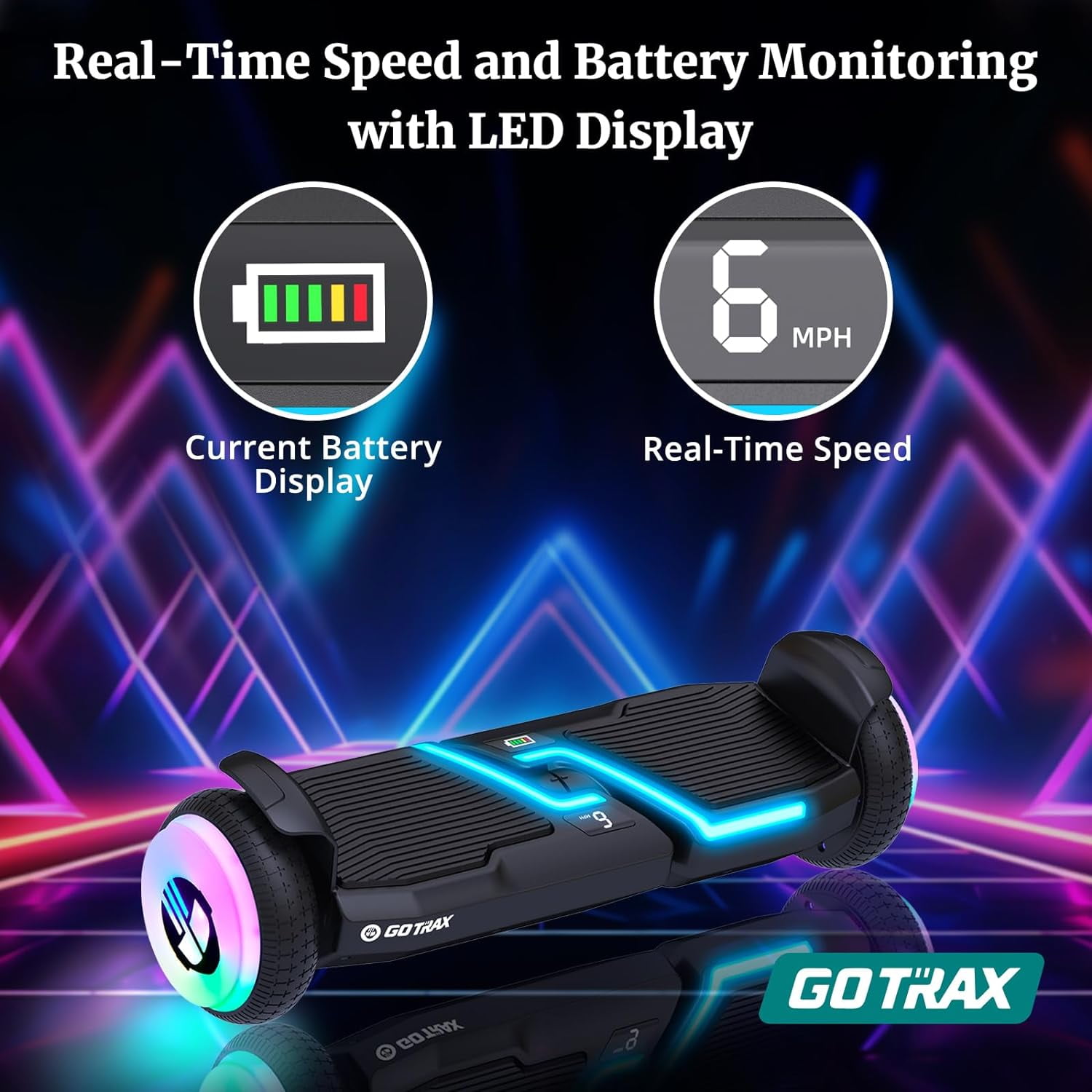 Embark on a futuristic journey with the Gotrax Mars Hoverboard for Child! This intelligent self-balancing scooter seamlessly combines cutting-edge technology with unparalleled comfort to deliver an unprecedented riding experience. The real-time speed and battery monitoring system, equipped with an LCD display, keeps you informed about your speed and battery status throughout your ride. This design not only allows you to manage your speed and enjoy the ride but also ensures you can keep a close eye on your battery level for timely charging. Product Specifications: Model: MARS Hoverboard for kids Dimensions: 25 x 8.7 x 8.35 inches Max Speed: 6.2Mph Max Distance: 5Miles(travel distance may vary based on rider weight and terrain) Weight: 15.05 pounds Recommended Age: 6 years and up Battery: 1 Lithium-Ion battery (included), 65.52Wh Motor: Dual 200W brushless high-powered motors Weight Capacity:176 pounds UL2272 Certified