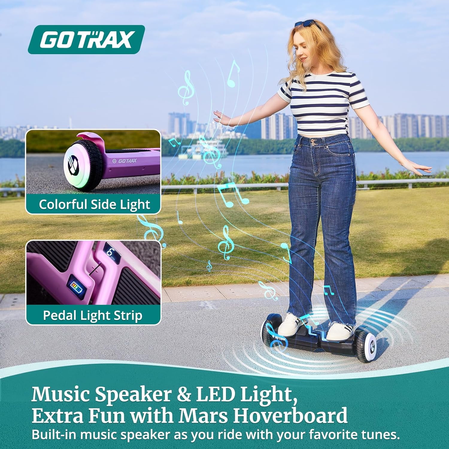 Real-time Speed and Battery Monitoring: The LCD display on the Gotrax Mars Hoverboard provides real-time information on speed and battery status, allowing you to stay updated during your ride. This design not only facilitates speed management and an enjoyable riding experience but also ensures you can monitor the battery status for timely recharging. Powerful Riding Experience: With dual 200W brushless high-powered motors, the MARS Hoverboard delivers a comfortable and smooth ride. Glide effortlessly at speeds up to 6.2 mph, thanks to the strong motors and a 65.52Wh low self-discharge battery. Cover up to 5 miles on a single charge, though travel distance may vary based on rider weight and terrain. Your ideal choice for quick, enjoyable journeys! Music Speaker and LED Lights: Enhance your hoverboarding adventure with the state-of-the-art Gotrax Mars model, complete with a built-in music speaker. Easily connect your smartphone to enjoy your favorite tunes as you ride. Plus, the hoverboard boasts vibrant LED lights, ensuring your safety during nighttime excursions while adding an extra layer of brilliance to your ride. Safety Electric Hoverboards: Gotrax Mars Hoverboard isn’t just about style; it’s also packed with safety features to ensure a secure and enjoyable ride. This hoverboard boasts a UL2272 certification, attesting to its rigorous testing and approval for electrical and fire safety. A built-in gyroscope and acceleration sensor ensure stability, and added safeguards like overheat protection, anti-tilt technology, and non-slip footpads make your ride secure and enjoyable. Gift with Support Service: Looking for a unique and budget-friendly gift for your loved ones? MARS is the perfect present for riders ranging from 44 to 176 lbs, whether kids ors. It will deliver happiness and thrill to anyone who receives it.