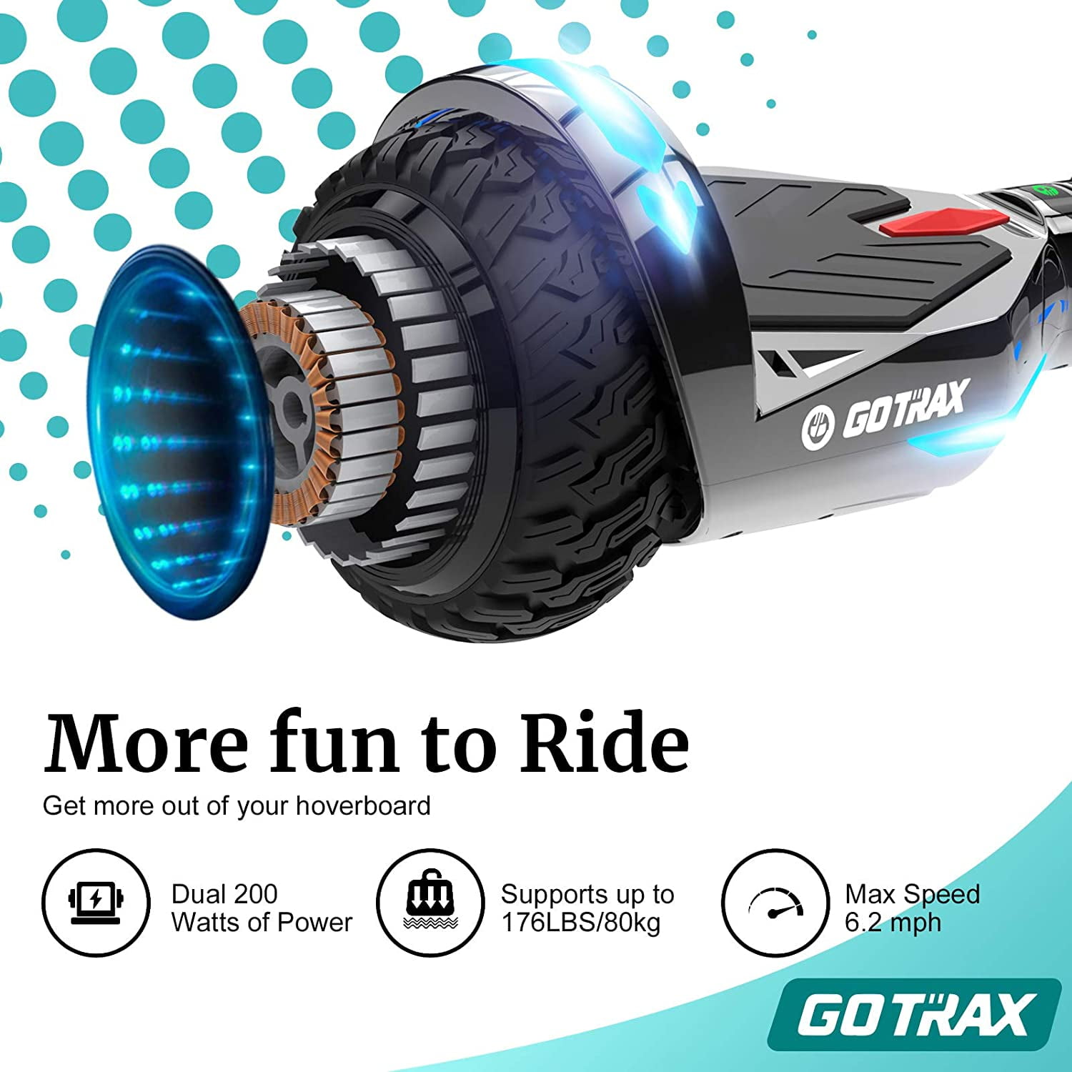 Speed and Power for an Exciting Ride:This hoverboard for kids ages 6-12 is designed for a thrilling yet safe riding experience. Powered by dual 200W brushless gear motors, it reaches a max speed of 6.2 mph, providing the perfect balance between excitement and control. Whether riding around the neighborhood or at the park, your child will enjoy a smooth and powerful ride every time. Long-Lasting Battery with Convenient Charging:Equipped with a 36V 2.6Ah lithium-ion battery, the hoverboard offers a range of up to 5 miles on a full charge. The performance can vary depending on the rider’s weight and road conditions, but it’s ideal for short commutes or fun rides. Plus, it only takes 4 hours to fully recharge, so kids can get back to riding in no time. The self-indicating battery lights also make it easy to monitor the charge level. Built-in LED Lights for Safety and Style:Your child will ride with confidence, thanks to the bright LED lights on the wheels, headlights, and mudguard. These lights not only add a cool style element but also improve visibility, ensuring a safer ride, especially during low-light conditions. The hoverboard’s 6.5-inch solid rubber tires provide stability and durability on various terrains. Durable Frame and Compact Design:Constructed from high-quality PC+ABS materials, this hoverboard is built to last. It can support riders up to 176 lbs (80 kg) while maintaining its lightweight structure, weighing only 14.26 lbs. Its compact size (24.6 x 7.2 x 7.5 inches) makes it easy to carry and store, perfect for kids to transport on their own. Enhanced Safety Features for All Riders:Designed with a 5˚ climbing capacity, this hoverboard offers excellent performance on slight inclines, ensuring a smooth ride on different surfaces. It’s also equipped with self-balancing technology, allowing kids to maintain stability and control with ease. 24-Hour Responsive Customer Support:We are dedicated to ensuring our customers’ satisfaction. We provide 24-hour responsive customer service, ready to assist with any questions about purchasing or resolving product issues. You can count on us for quick and effective solutions.