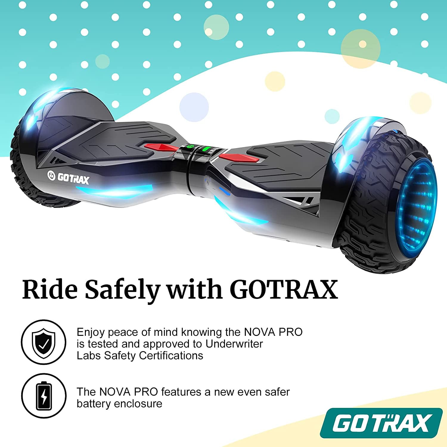 Discover the excitement of the NOVA PRO Hoverboard, launched by GOTRAX in 2017 and quickly becoming a leader in the category. Weighing only 14.26 lbs, this lightweight hoverboard is perfect for younger riders and easy to transport. Experience exhilarating rides with a max speed of 6.2 mph, powered by dual 200W brushless motors for smooth control on various terrains. Safety is a priority with 6.5-inch solid rubber tires for stability and a durable PC+ABS frame supporting riders up to 176 lbs. The built-in LED wheels and headlight enhance visibility during low-light conditions, while the 36V 2.6 Ah lithium-ion battery offers up to 5 miles of range on a 4-hour charge. As one of the most affordable options available, the NOVA PRO is the perfect gift for kids, encouraging outdoor fun without sacrificing quality. Join the hoverboard revolution and enjoy safety, performance, and excitement for riders of all ages! Mile Range: MAX 5 mile (Actual performance will be affected by user’s weight, road) Motor: Dual 200W brushless gear motors Speed: MAX 6.2 mph Battery: 36V 2.6 Ah lithium ion battery Light: LED wheels and headlight, mudguard light Charging Time: 4 hours Climbing Capacity: 5˚ Frame Materials: PC+ABS Wheels Size: 6.5inch Solid Rubber Max Load: 176lbs/80 kg Net Weight: 6.47Kg/14.26lb Product Dimensions: 24.6 x 7.2 x 7.5 inches