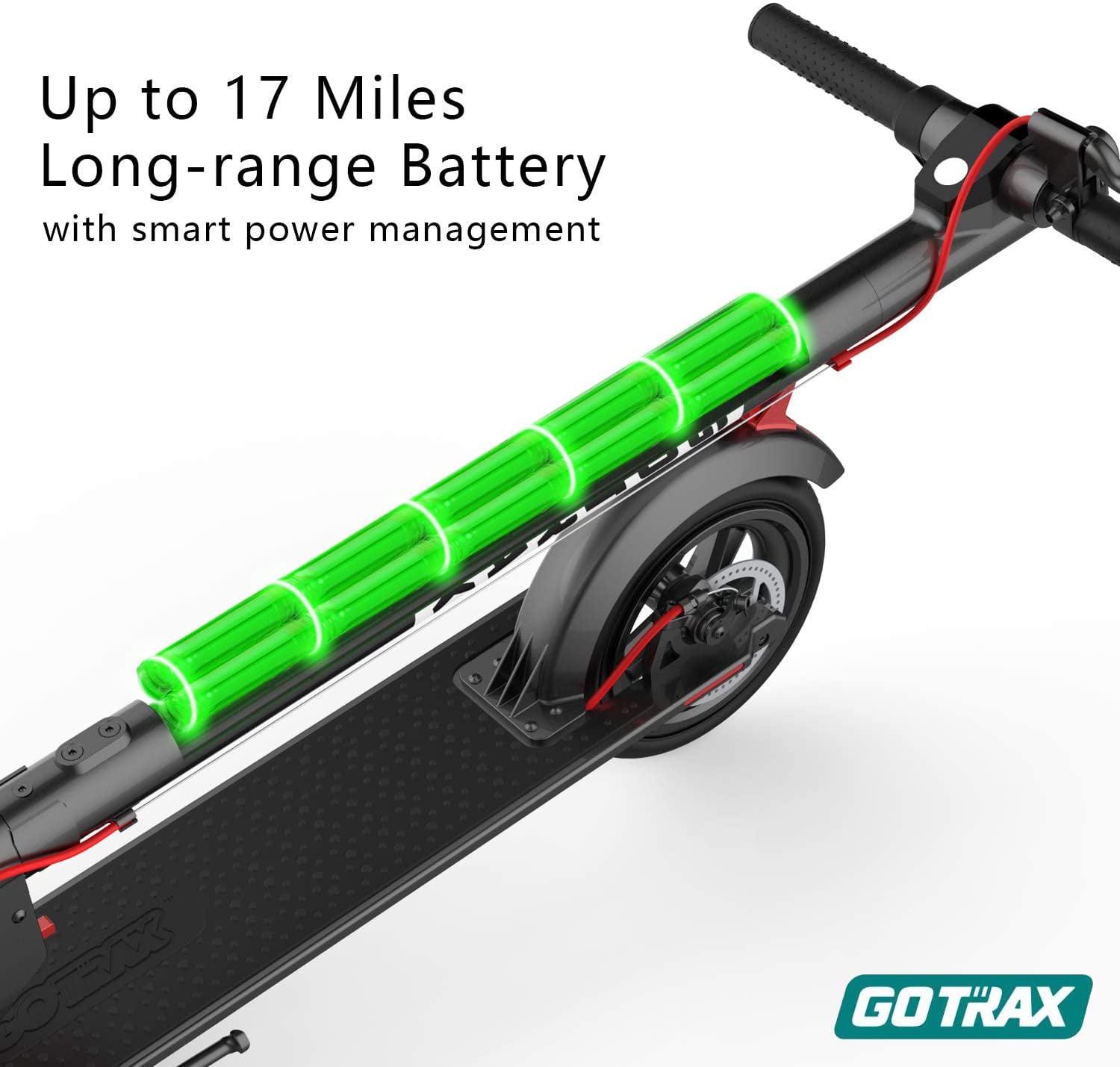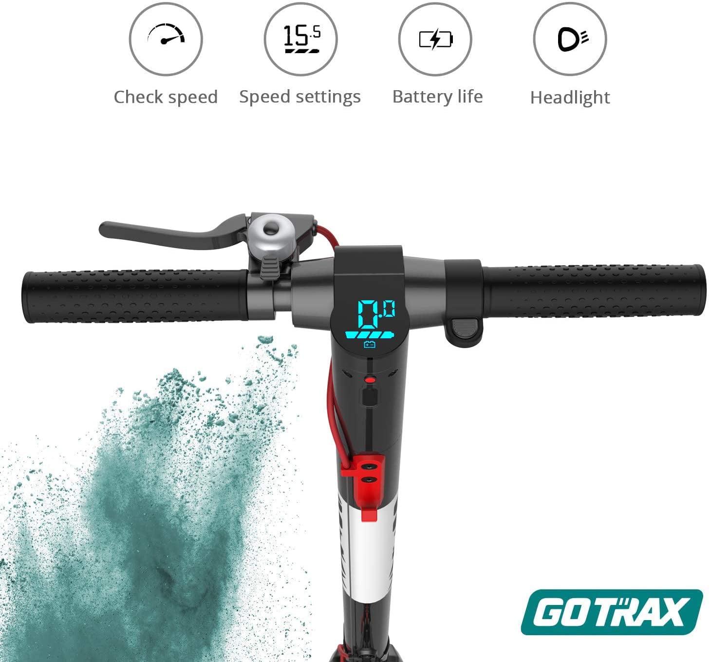 – Strong Power E Scooter – The adult electric powered scooter features a quiet 300W motor, boasting top speed of 15.5 MPH and max load of 220 lbs. Tackles steep hills with ease, making it a perfect commuting scooter. To ride your GOTRAX E-scooter safely, put one foot on the scooter and the other on the ground to push off. Once you go faster than 1.8mph, you can use the throttle and the scooter will move on its own