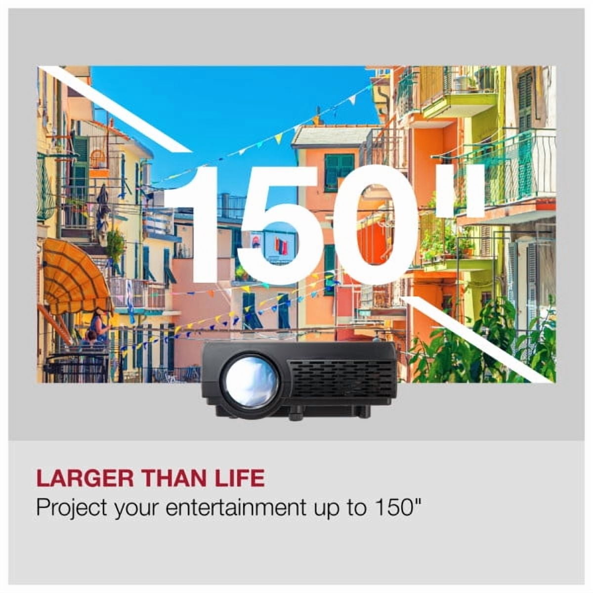 Turn any space into entertainment central. Project your favorite movies, games and photos up to a 150″ screen size with HDMI, USB, and AV. Easily adjust the picture for the best viewing angle with manual focus and angle correction. Connect your speakers to the audio out, a Bluetooth speaker, or use the built-in speaker to complete the scene. This offer includes: (1) projector, a remote control that requires (2) AAA batteries(not included), a 3.5mm to RCA audio/video adapter, a AC/DC power adapte, a 90 Day Limited Warranty and a complete User’s Guide.