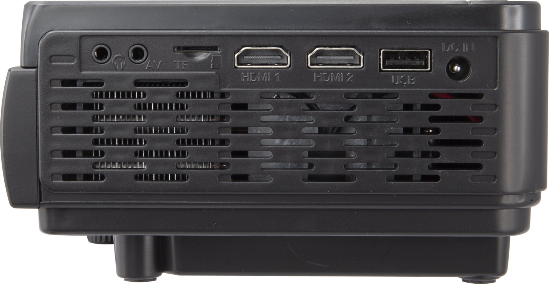 Up to 150 in. viewable screen size; aspect ratio: 16:9, 4:3 800 x 480 native resolution Brightness: 2000 peak lumens; 42 ANSI lumens Supports: 480p, 720p, 1080i, 1080p 2 HDMI inputs; 3.5 mm A/V input; VGA PC video input; DC power input: requires an AC/DC power adapter (included) USB port; microSD card slot 3.5 mm headphone/audio output; built-in speaker LED bulb with 20,000-hour life Built-in Bluetooth wireless transmitter; Bluetooth range: 33 ft. Manually adjustable focus and keystone angle correction; mountable Display distance: 3.9 ft. to 12.1 ft. (1.2 m to 3.7 m) Dimensions: 7.87 in. x 6.06 in. x 3.27 in. Includes remote (requires 2 AAA batteries; not included), 3.5 mm to RCA A/V adapter, and AC/DC power adapter