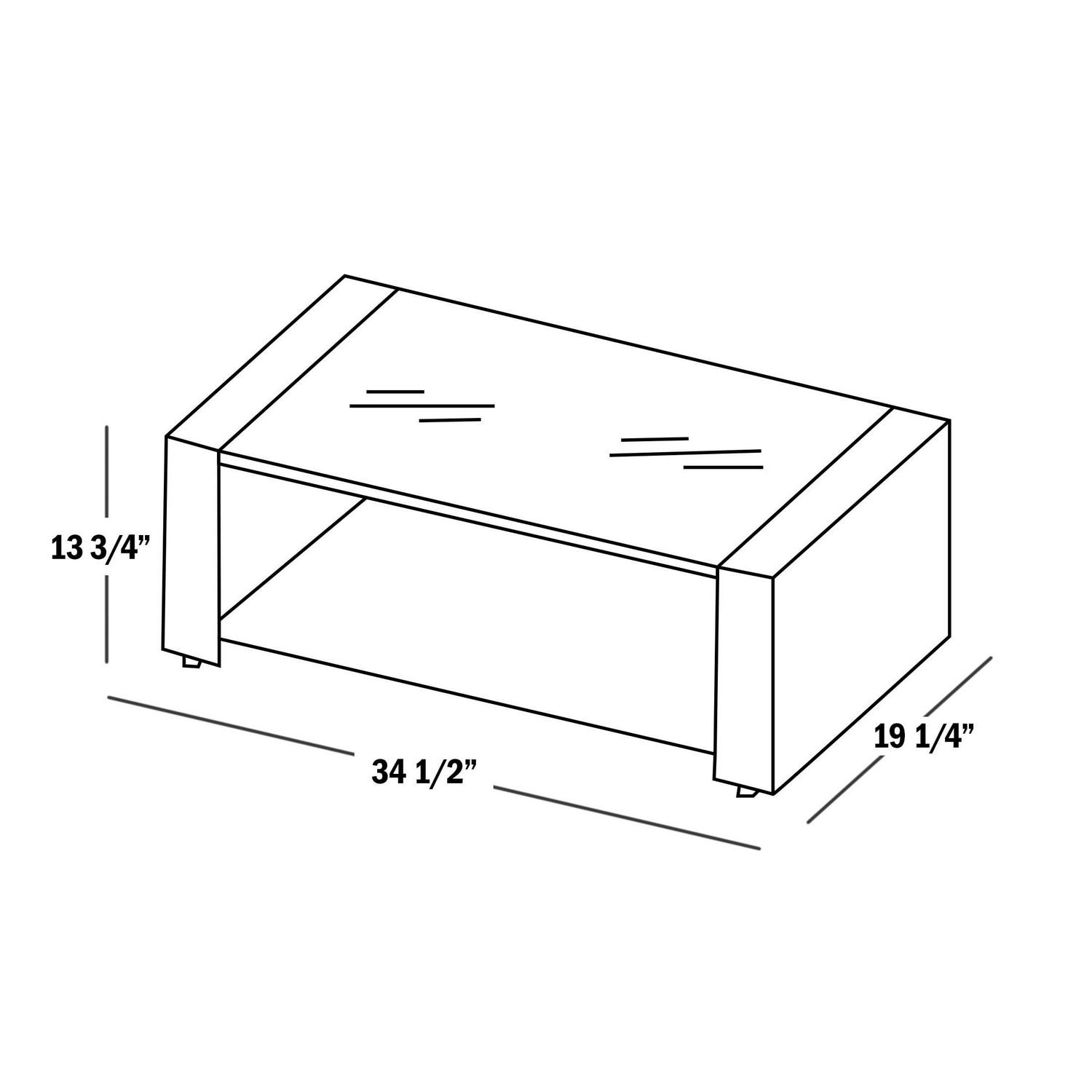 – Coffee Table: 34.5 inches wide x 19.25 inches deep x 13.75 inches high