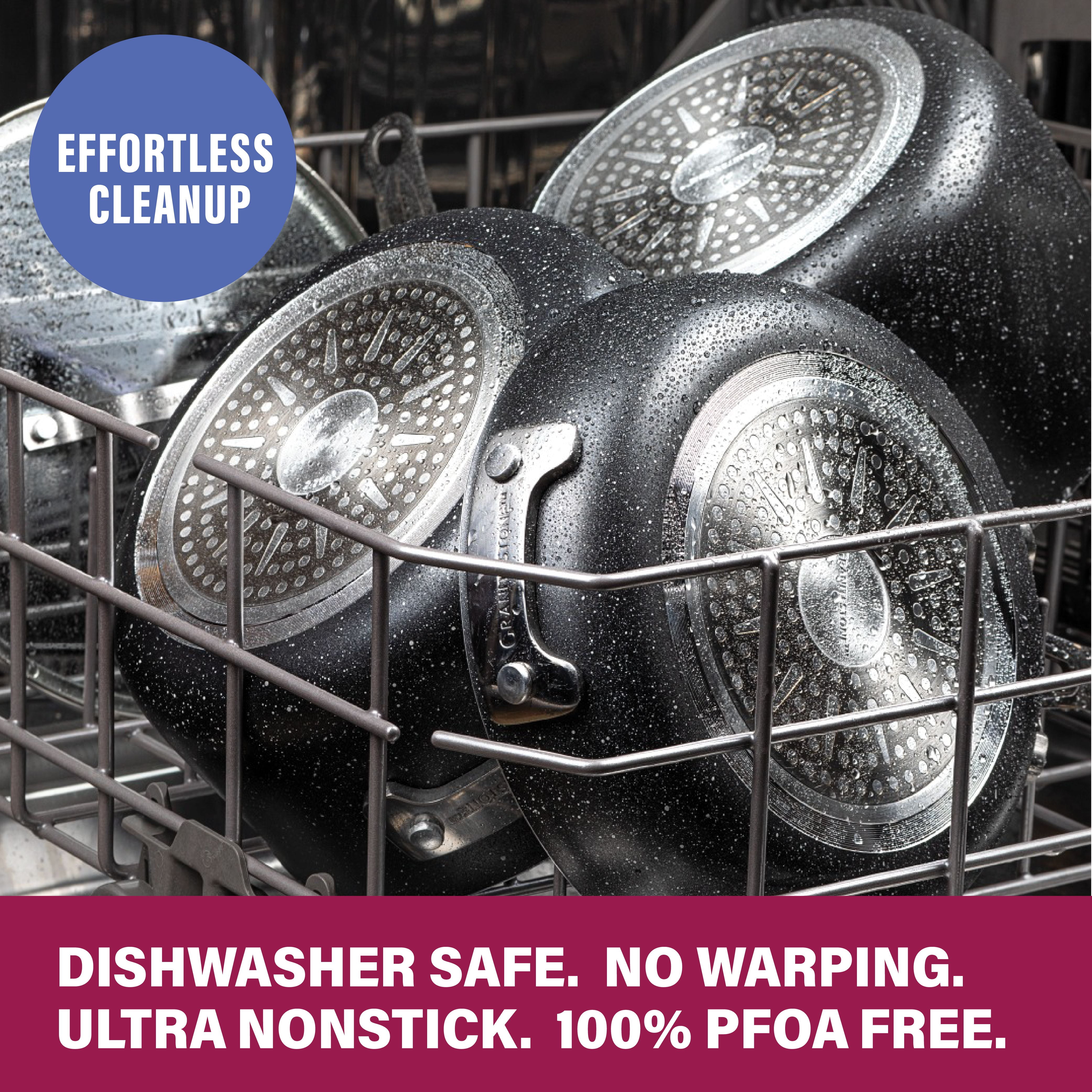 – This Granitestone Stackmaster three-piece nonstick cookware set features stainless steel cool-touch handles for safety, and the aluminum exterior provides durability.