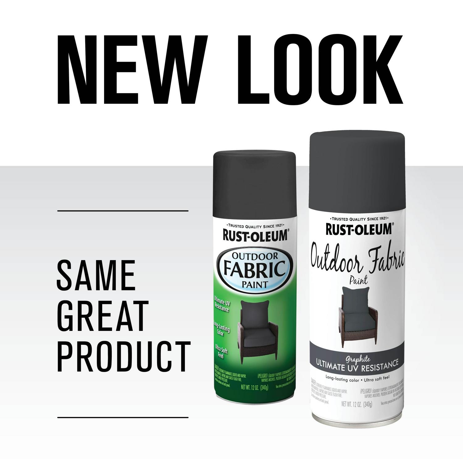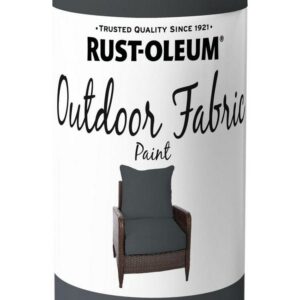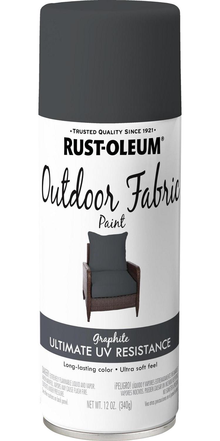 Graphite, Rust-Oleum Specialty Matte Outdoor Fabric Spray Paint- 12 oz, 6 Pack: Is an easy way to refresh your worn outdoor fabrics with color. It provides broad coverage with excellent adhesion and flexibility. Fabrics stay soft to the touch and maintain long-lasting color. Its UV and weather resistant barrier makes it ideal for outdoor fabrics. Great for use on outdoor furniture cushions, pillows and more. (Softer than regular spray paint.)