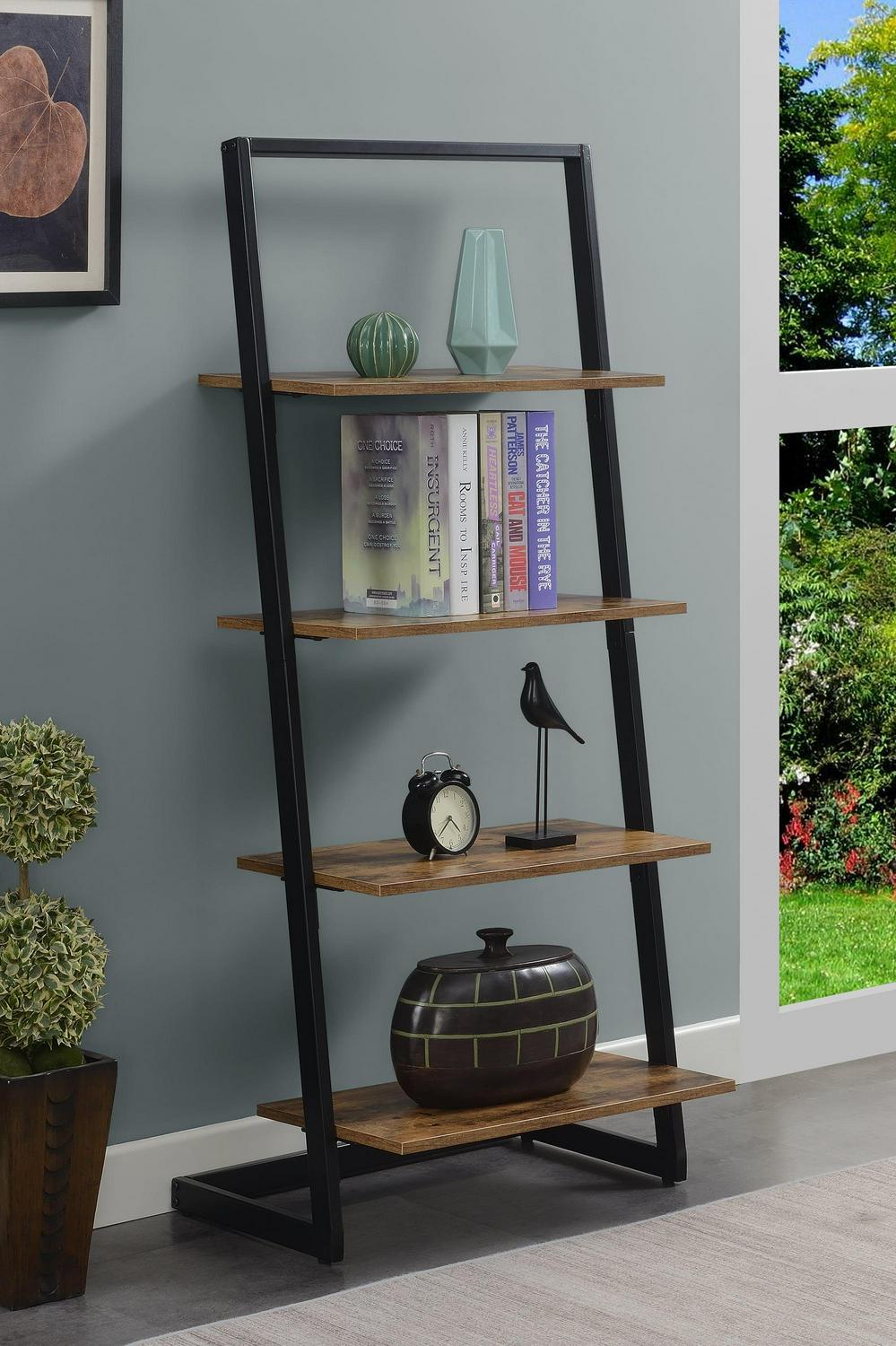 Graystone Ladder Bookshelf The Graystone Ladder Bookshelf by Convenience Concepts makes for the perfect display or storage unit in any room of your home. Available in multiple finishes, this piece features 4 tiers of spacious shelving for collectibles, books, or even storage. Versatility is endless thanks to its unique urban design. This bookshelf ladder can be placed in the living room, office, or any room that needs additional display space. Crafted with particleboard, melamine veneer, and powder-coated metal, this shelf was built to last. Coordinate with additional pieces from the Graystone Collection, each sold separately.