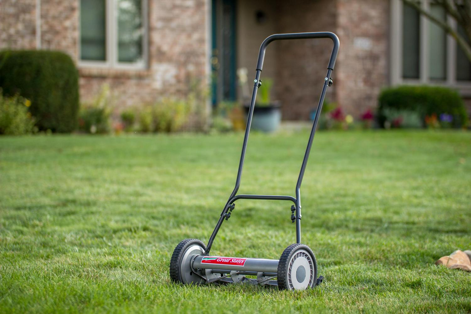 Great States 18″ 5-Blade Reel Mower. A clean, precise, scissor-like cut for your lawn, and no fuel needed! Skip the gas. Skip the oil. Skip the fumes. Skip the cords. Skip the noise. You don’t need any of it, not when you’ve got the man-powered 18″ mower from Great States. Smooth-spinning blades, easy-roll wheels, and height adjust-ability combine to deliver the perfectly groomed look you want. Quiet operation and zero carbon emissions make owning a reel lawn mower an easy choice.