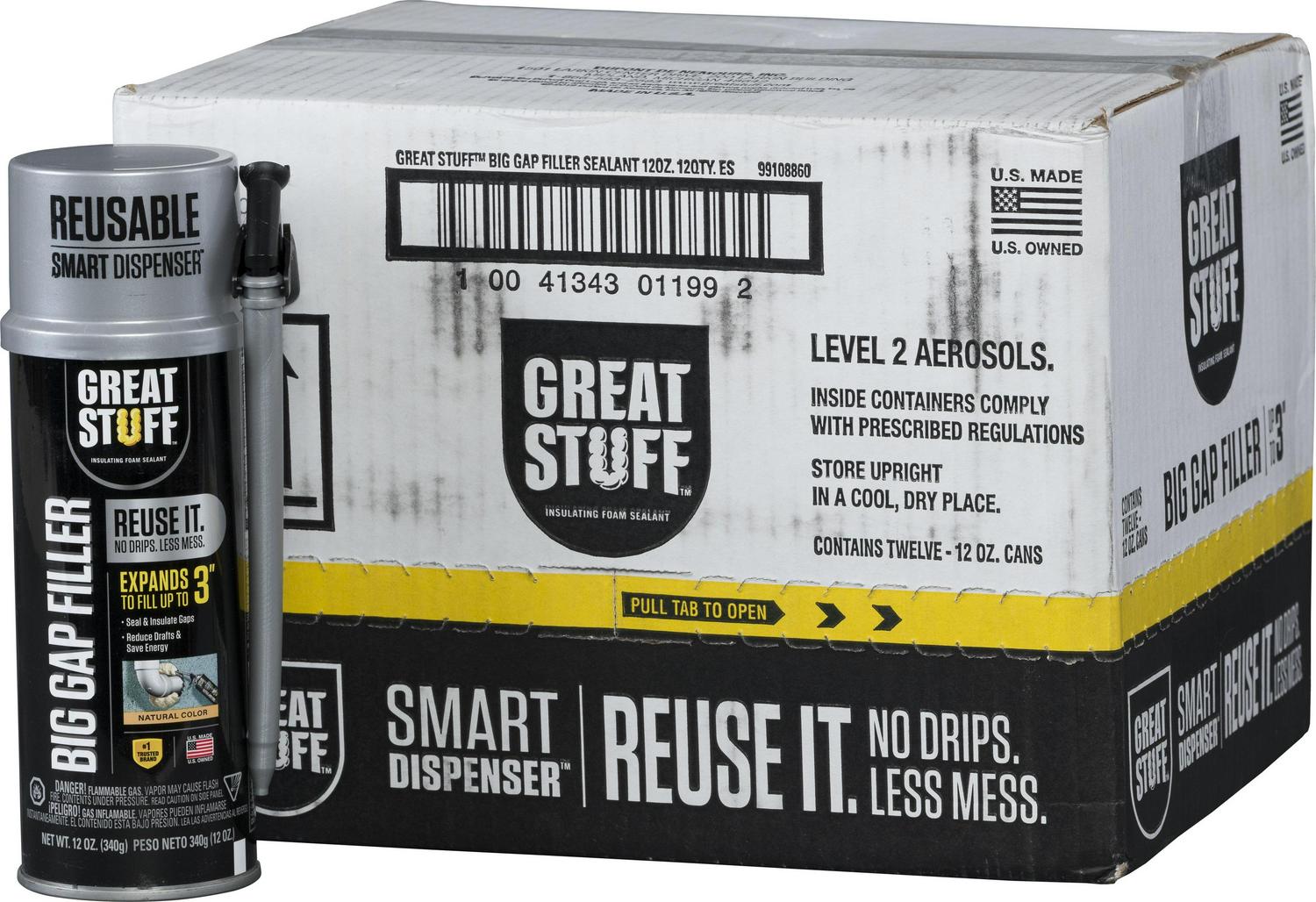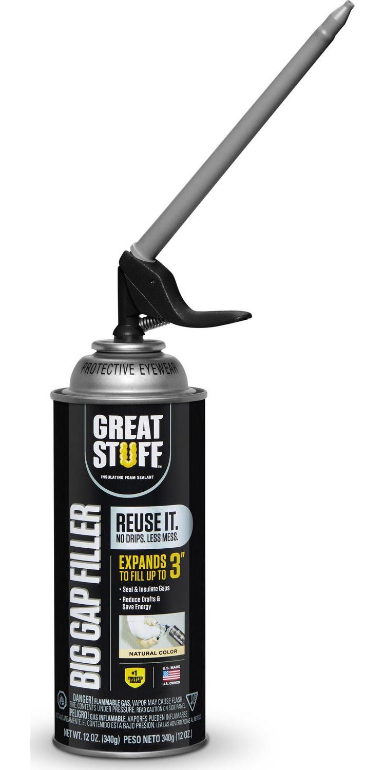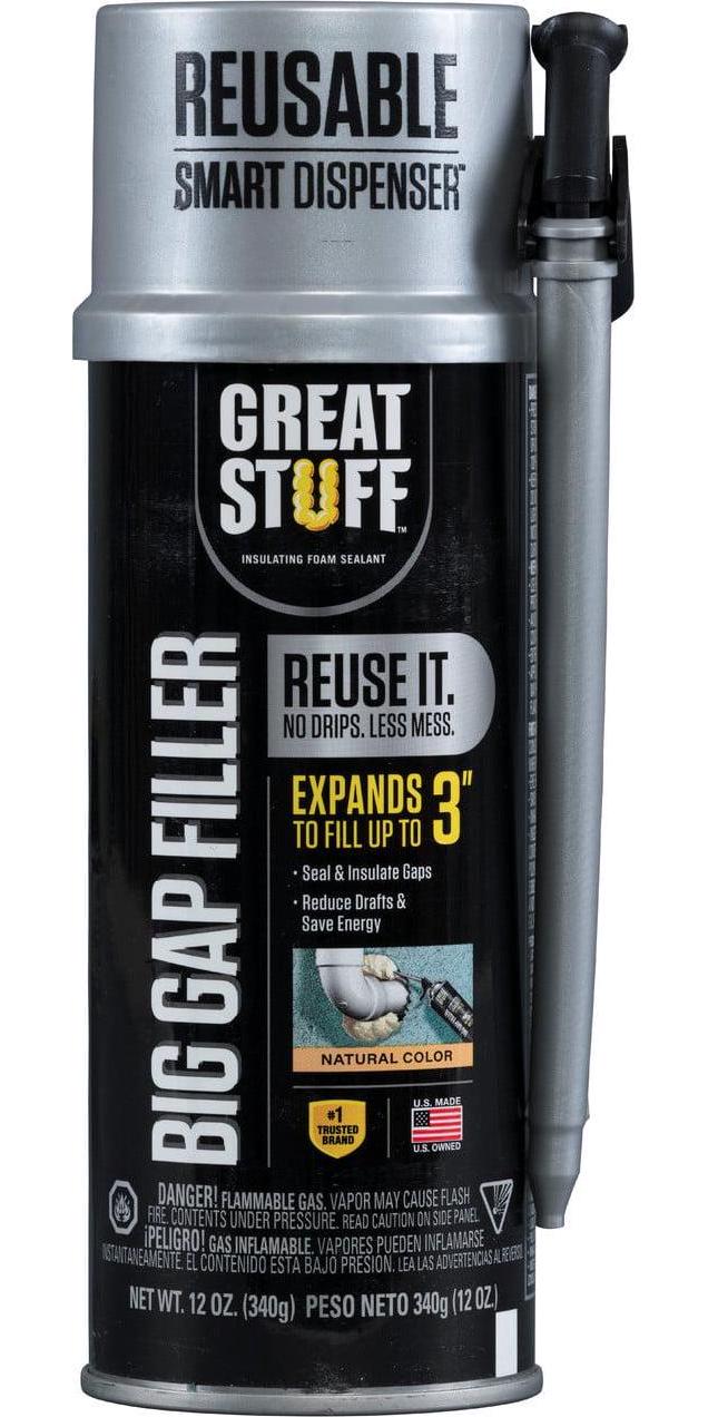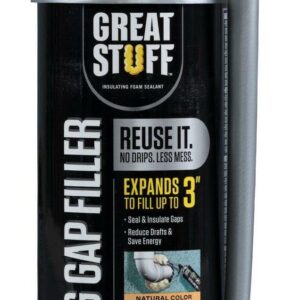 Great Stuff Big Gap Filler Insulating Foam Sealant is a ready to use expanding polyurethane insulating foam sealant that fills, seals and insulates gaps up to 3 inches. The average home has a half mile of gaps and cracks where air and moisture can enter. Air sealing and insulating projects around the home can typically save homeowners up to 30% on home energy costs, according to the Residential Energy Services Network (RESNET). Seal out energy loss and improve comfort with Great Stuff Big Gap Filler Insulating Foam Sealant. Great Stuff expands to take the shape of gaps, creating a long lasting, airtight and water resistant seal. It’s a simple way to minimize unwanted air flow and reduce condensation. New Smart Dispenser design eliminates mess and product waste by providing a precise application with no drips. The application is maneuverable and intuitive to use with a simple, trigger gun which saves time. The Smart Dispenser allows the user to reuse Great Stuff for up to 30 days.