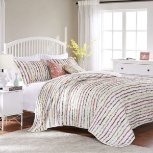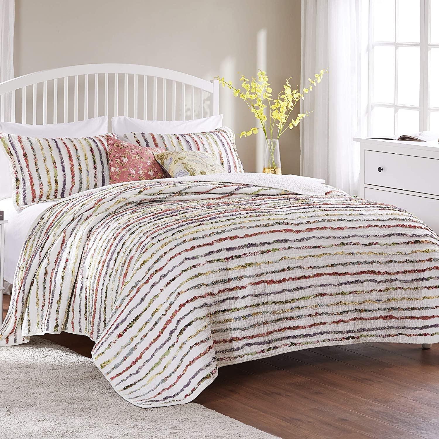 Ruffles of floral printed fabrics are carefully sewn to an off-white ground on the face of this frayed edge quilt, giving it a shabby chic look and feel. Eye-catching yet casual, this romantic style coordinates with a variety of colors matches a wide range of color themes. Oversized for better coverage on today s deeper mattresses. Cotton face, back and fill. Prewashed and preshrunk. Machine washable. Set includes: Quilt, two pillow shams, plus two coordinating decorative pillows (one sham only per Twin set). Twin Dimensions: Quilt 68×88 , Sham 20×26 , Decorative Pillows 16×16 each. Full/Queen Dimensions: Quilt 90×90 , Shams 20×26 each, Decorative Pillows 16×16 each. King Dimensions: Quilt 105×95 , Shams: 20×36 each, Decorative Pillows 16×16 each.
