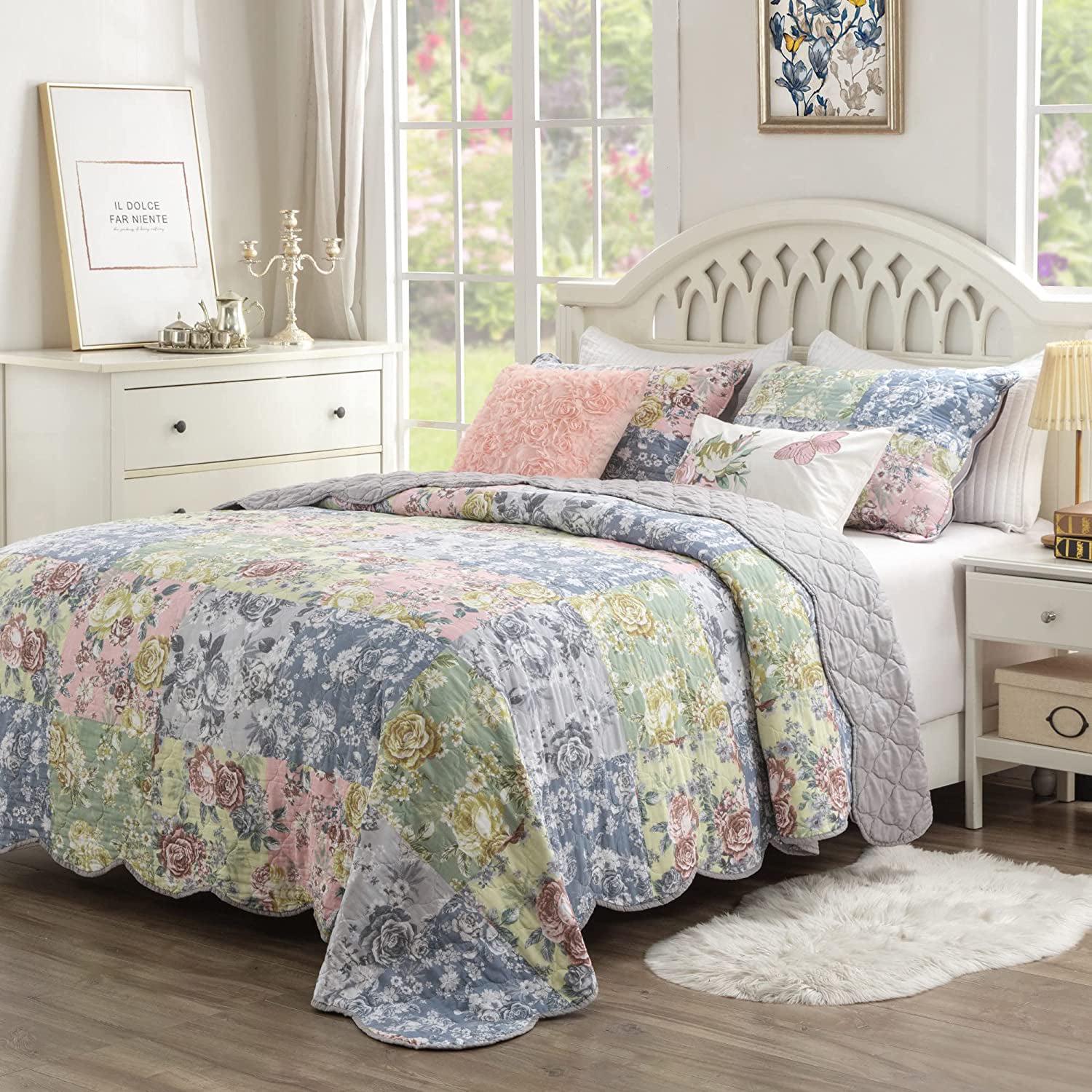 Constructed from cotton fabric with scalloped borders and a cotton-rich fill, Emma features florals in a patchwork of alluring hues. Lightweight for year-round layering and comfort, this new classic from Greenland Home Fashions will feel right at home with a variety of interior decor themes. The patchwork print is overstitched in a vermicelli pattern that offers durability with surface interest. Reverses to an all-over neutral gray for easy pairing with any sheet set in your linen closet. Oversized for better coverage on today s deeper mattresses. Quilt set comes with quilt and two pillow shams (one sham per Twin set). Dimensions: Twin set includes one 68×88-inch quilt plus one 20×26-inch pillow sham, Full/Queen set includes one 90×90-inch quilt plus two 20×26-inch pillow shams, King set includes one 105×95-inch quilt plus two 20×36-inch pillow shams. King size fits California King beds. All dimensions +/- 2 inches.. Machine quilted with fabric bound edges for durability. Machine washable. 100% Cotton face; brushed microfiber back; cotton rich 60% cotton, 40% polyester fill. Imported
