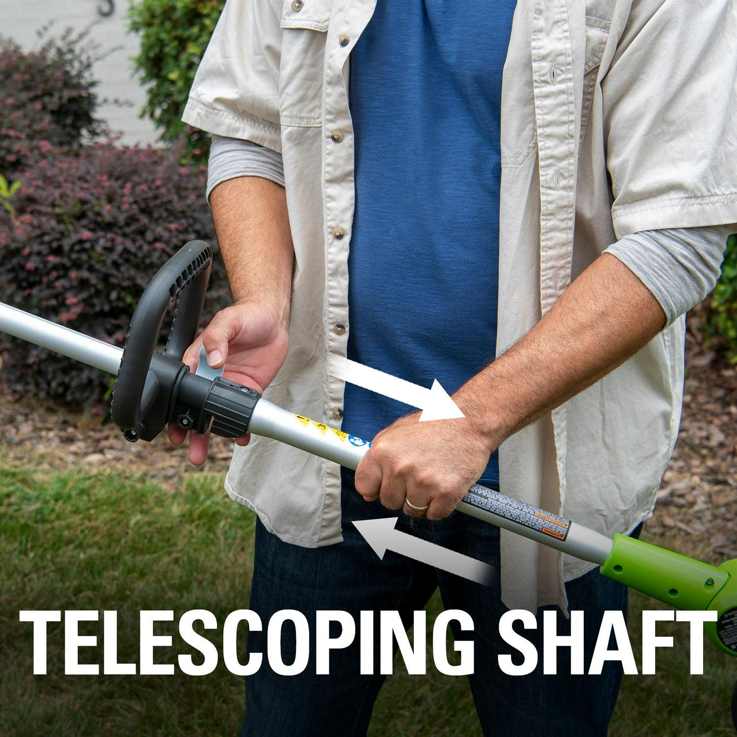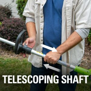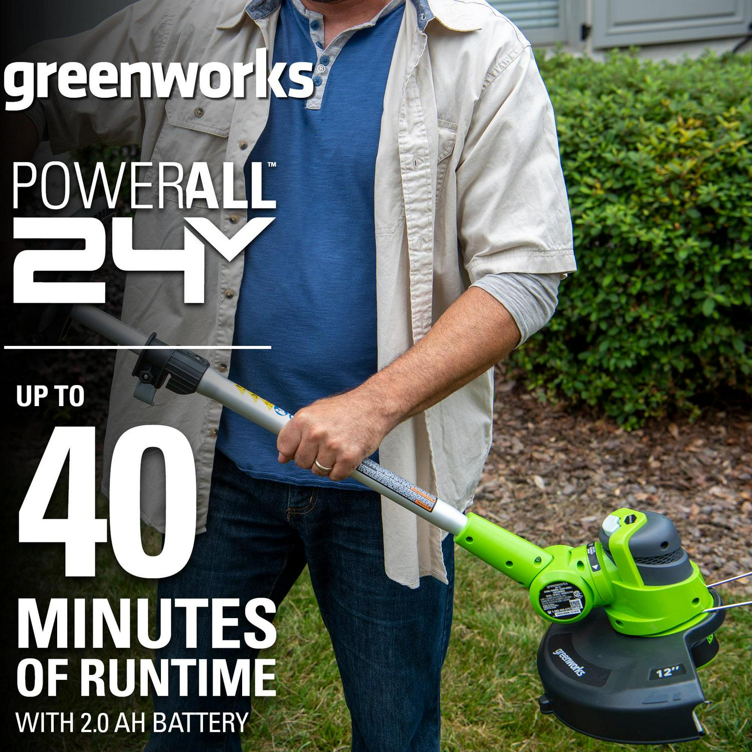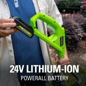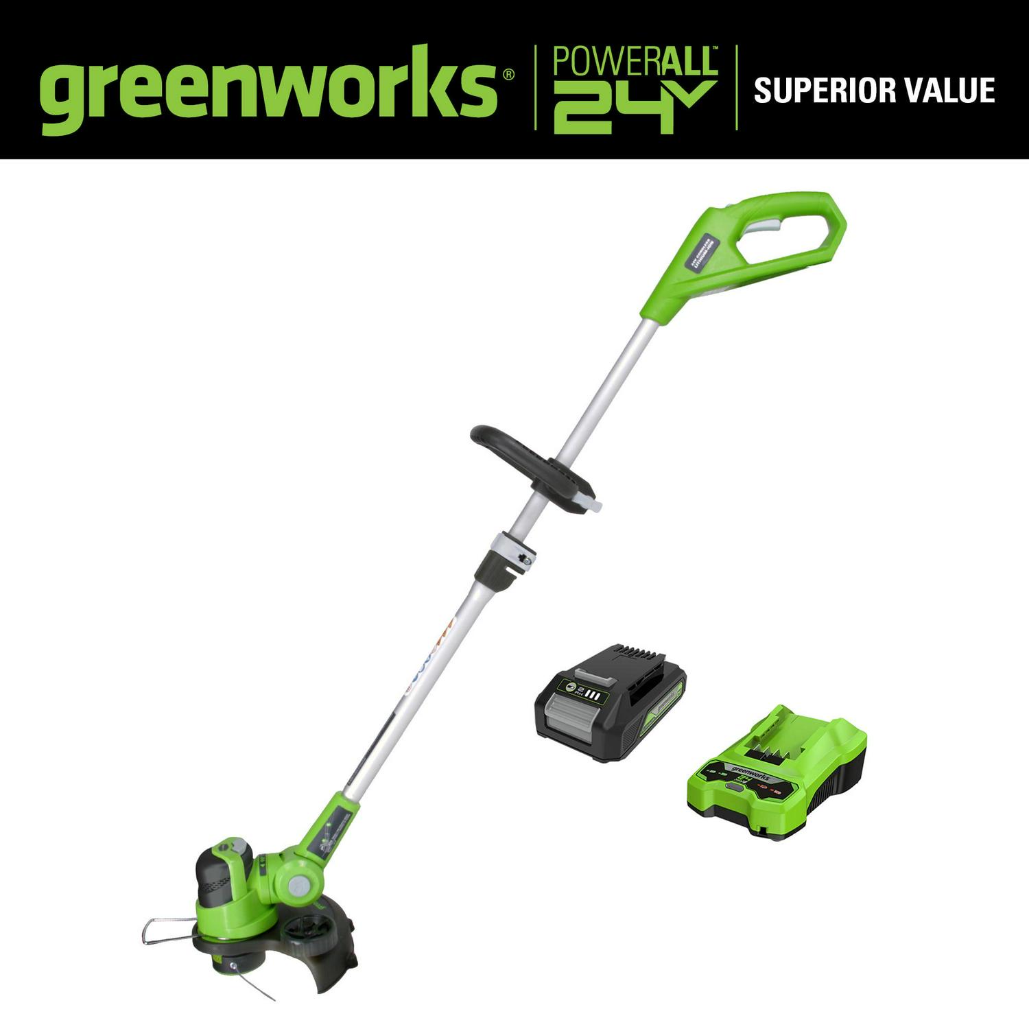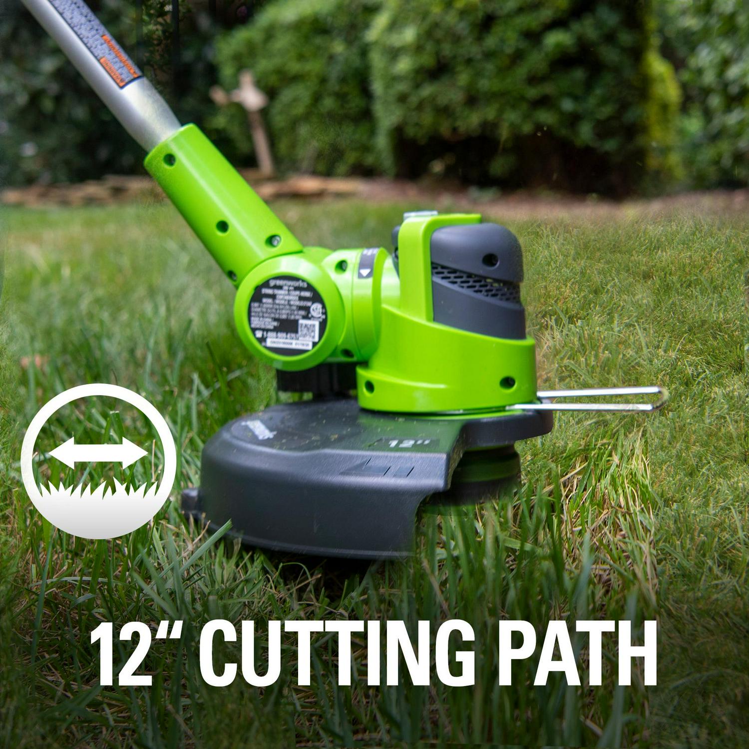 Greenworks 21342. Features: 24V Lithium-Ion power delivers fade-free power with no memory loss after charging.. Adjustable 10 in. – 12 in. cutting path for quick and easy trimmer with powerful results to cut through the toughest weeds.. Versatile design with 3-position pivoting head for easy trimming at multiple angles.. 90 degree rotating head with edging wheel for walk behind edging for versatile use.. .065 in. single line auto-feed head for fast results.. Adjustable auxiliary handle, over-mold grip and forearm rest for added user comfort.. Compatible only with Greenworks G-24 battery model 29842 and Charger 29862.
