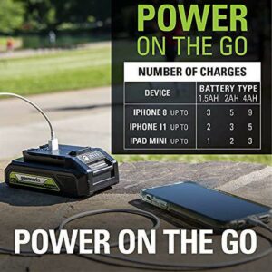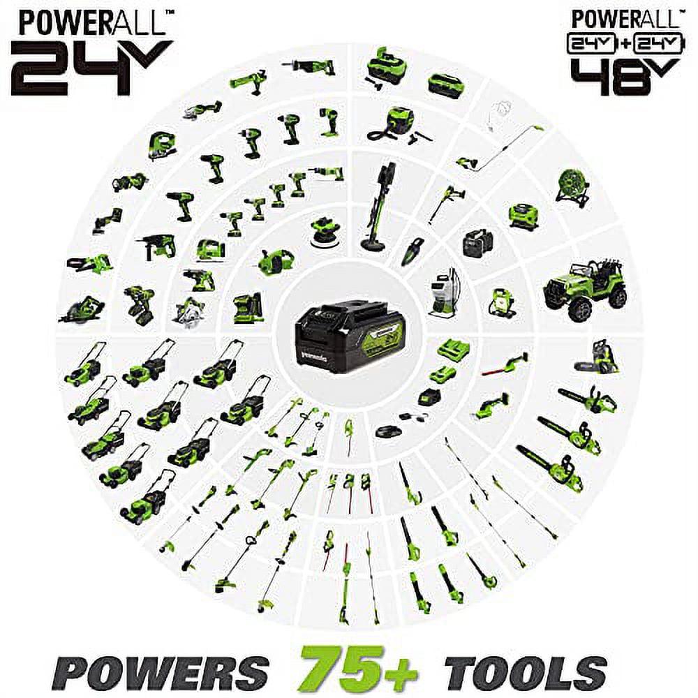 – Greenworks 24V Lithium-Ion battery provides 20% more power and 35% more run-time, and delivers fade-free power with no memory loss after charging