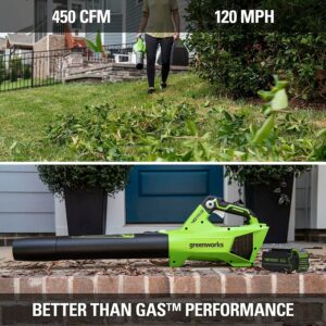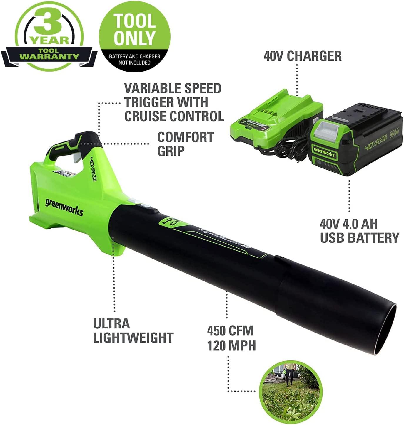 Greenworks 40V (120 MPH / 450 CFM) Cordless Axial Blower, 4Ah USB Battery (USB Hub) and Charger Included