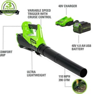 – Greenworks Axial Blower: Up to 20 minutes of blower runtime with a fully-charged 4.0 Ah battery (based on low setting)