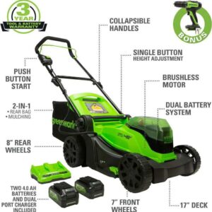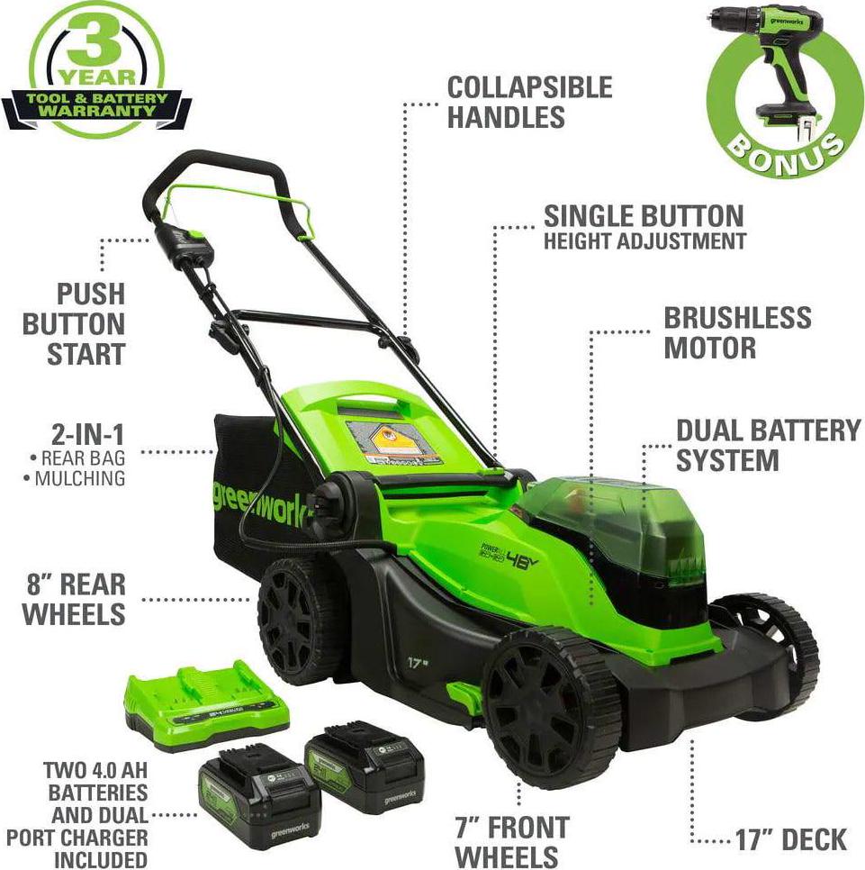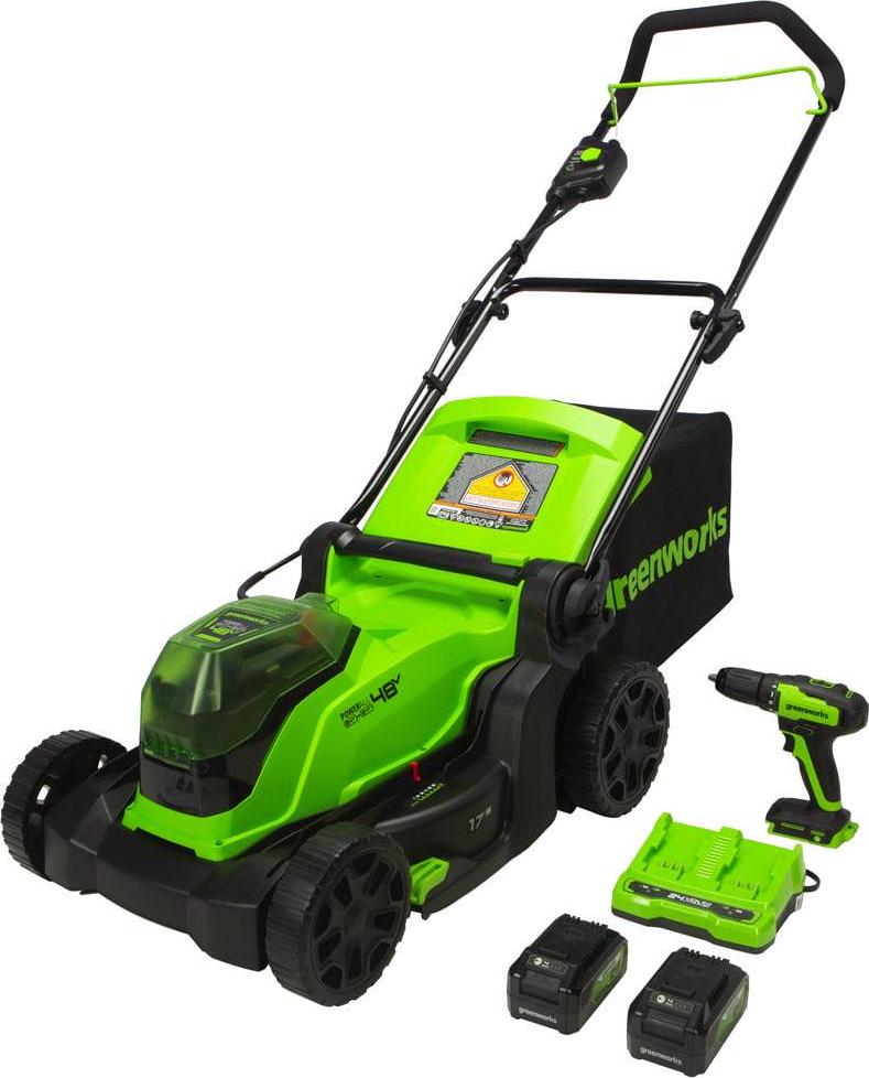 Greenworks 48V 17 Brushless Cordless Lawn Mower + 24V Brushless Drill / Driver, (2) 4.0Ah USB Batteries (USB Hub) and Dual Port Rapid Charger Included (2 x 24V)