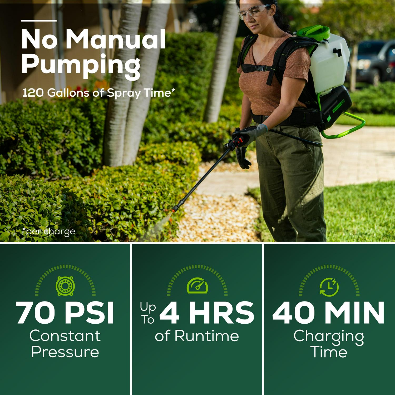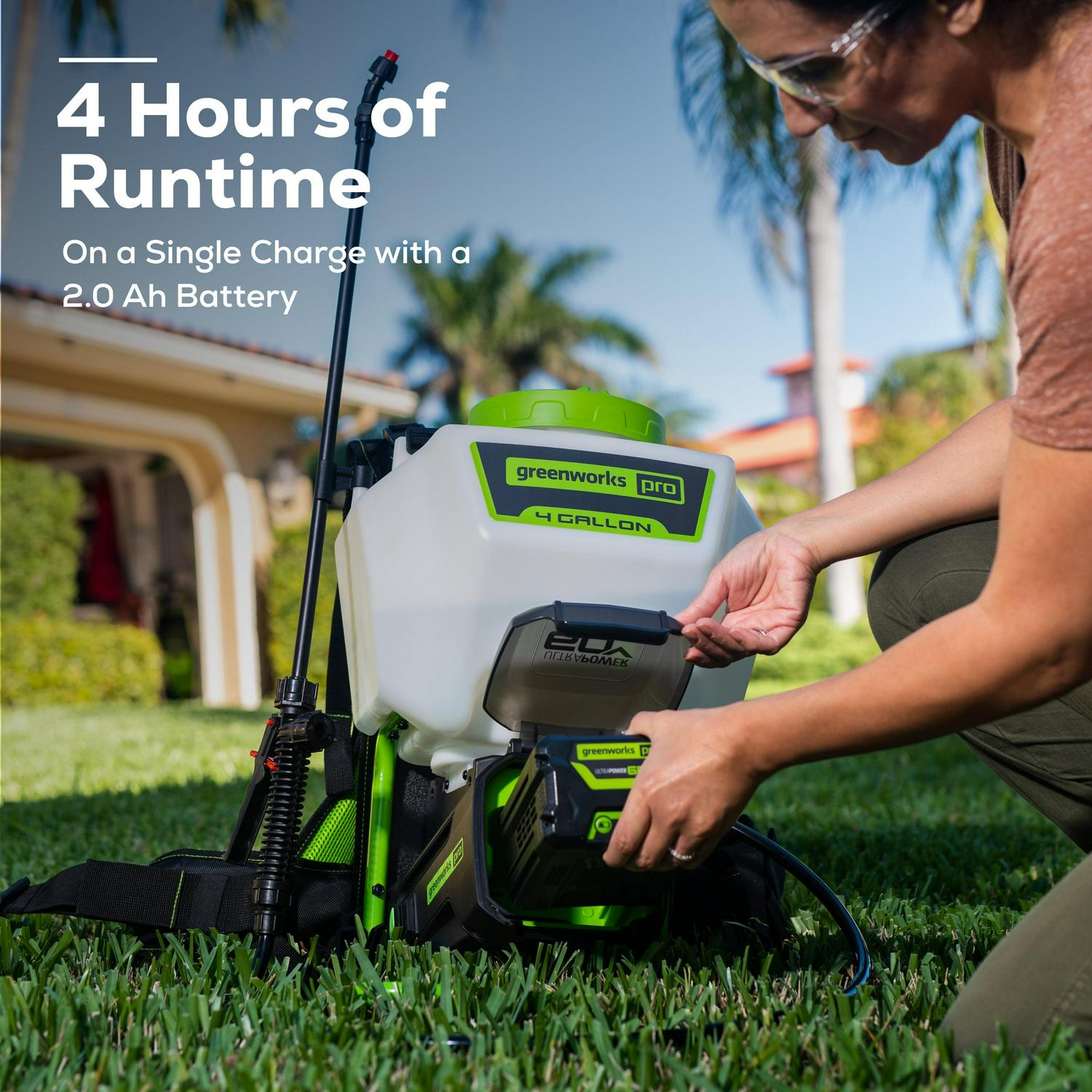 Greenworks 60V 4 Gallon Lithium-Ion Battery Cordless Backpack Sprayer has 4 hours of runtime and an impressive 120 gallons of spraying with just one fully charged 2 Ah battery. Safely use extensive array of chemicals with high-density polyethylene tank housing and easily do it with a wide-mouth tank opening. No manual pumping is required; the powerful diaphragm pump and motor instantly start the job and deliver constant pressure up to 70 PSI and will spray up to an impressive distance of 20 feet. Includes 5 nozzles and features onboard storage. Built tough with a heavy-duty steel frame and overall is lightweight; only weighing in at 11.68 pounds before filling up. Easily detect how much liquid is left with the translucent tank and have full control of spraying with a hose that reaches 4 feet. The battery has a shielding compartment to protect the battery from elements and is completely secured safely from spraying while working.