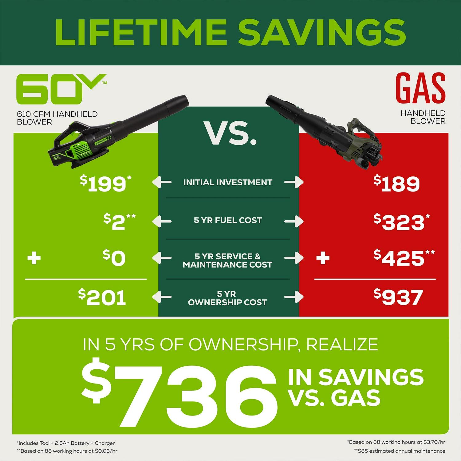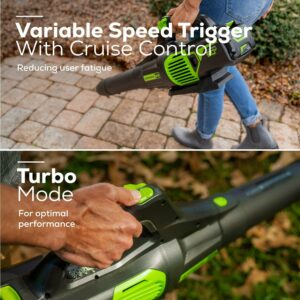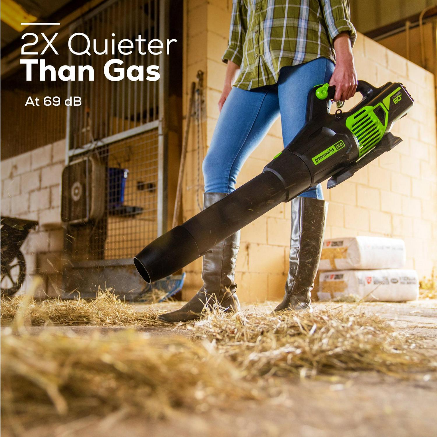 Powered by a pro-grade 60V lithium-ion battery, this Greenworks Pro 60V cordless leaf blower delivers more power and performance than typical gas-powered blowers, without the noise, fumes, or harmful emissions. With incredible blowing force of 130 MPH max air speed and 610 CFM max air volume, it easily outperforms a professional-grade 26cc gas-powered blower. It features our Jet Fan Technology, with the best power-to-weight ratio in the industry, and is equipped with a turbo button, trigger-activated variable speed control, and cruise control. This compact, lightweight blower starts with the squeeze of a trigger, with no aggravating pull cord. Plus, there’s no need to worry about spilling, mixing, or storing oil and fuel. The powerful Greenworks Pro 60V UltraPower cordless battery platform gives you all the power you need to tackle all your lawn care projects. Kick gas to the curb this spring and go green with no fumes, no mixing, no maintenance and no pull cords. Let Greenworks help you take the work out of yard work.