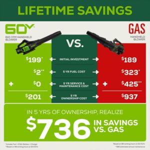 – Up to 610 CFM of air volume at 130 MPH to power through debris and wet leaves