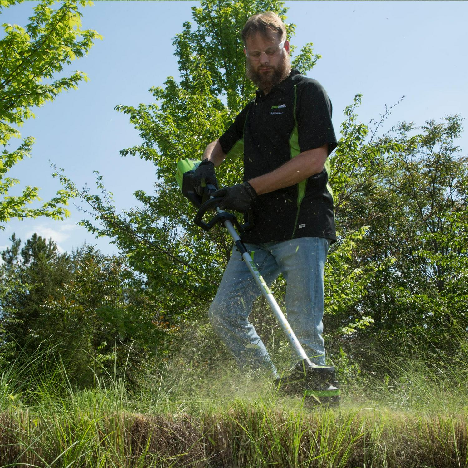 Greenworks 80V System offers a range of commercial grade tools for the professionals and those who just want more power. This 16-inch cordless string trimmer features an front mount motor for versatile use. Light weight and easier to use, it has a variable speed trigger for power on demand, 14/16-inch cut path, .080 line diameter bump feed and die cast gear box for durability. Designed for durability and heavy duty jobs, it features a brushless motor that delivers the power and performance of a 32cc gas engine. With an extra battery on hand, you can now rip through weeds in neighborhood without the hassle of gas. Compatible batteries currently include a 2ah (model GBA80200) and 4ah (model GBA80400) battery and rapid charger (model GCH8040). The 2ah battery charges within 30 minutes so you can get back to work and finish that job. The 4ah battery charges within 1 hour. Equivalent to 26cc gas engine.