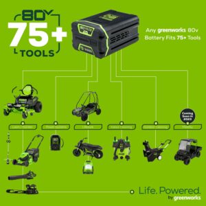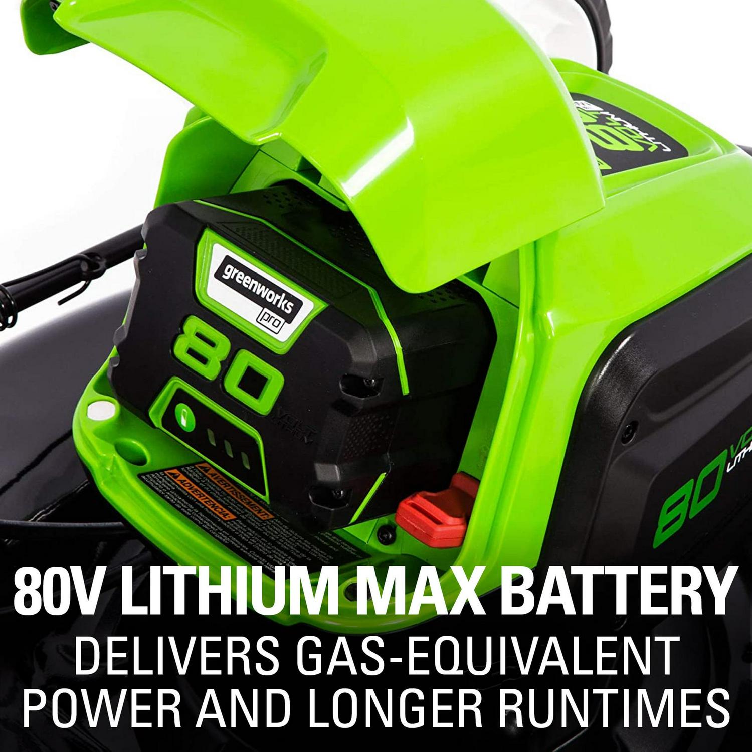 When it comes to outdoor power equipment, you put the emphasis on power. And why not For homeowners like you who take on jobs big or small, you need heavy grade construction and long-lasting peak performance. Powered by an 80V brushless motor, the Greenworks 80V 21 Brushless Push Lawn Mower with 4.0Ah Battery & Charger delivers gas equivalent power and torque to effortlessly cut through even the thickest grass. The heavy-duty 21″ steel deck ensures strength and longevity, promising years of reliable use. With SmartCut technology, the mower automatically adjusts power based on grass height for maximum performance and efficiency. Say goodbye to bulky storage woes with the vertical storage feature, allowing you to use up to 70% less space in your garage. The convenient 3-in-1 cutting deck offers the flexibility to choose your cut finish from mulching, bagging, or side discharge, catering to your lawn maintenance preferences. The single lever 7-position height adjustment provides a range of cutting heights from 1-3/8″ to 3-3/4″, giving you full control over the look of your lawn. Maneuvering through various terrains is a breeze with the 10″ rear wheels and 8″ front wheels, ensuring smooth navigation. This mower comes with an 80V 4.0 Ah Battery & Rapid Battery Charger, providing you with all you need for extended operation. With a 4-year limited tool & battery warranty, you can have peace of mind knowing that your investment is protected. Upgrade your lawn care routine with the Greenworks 80V 21 Brushless Push Lawn Mower with 4.0Ah Battery & Charger. The Greenworks Pro 80V family of tools meet the challenge with a universal battery system that works across multiple products, high-efficiency motors, and innovative smart technology. All Greenworks Pro 80V tools feature a 4 Year Limited Tool & Battery Warranty.