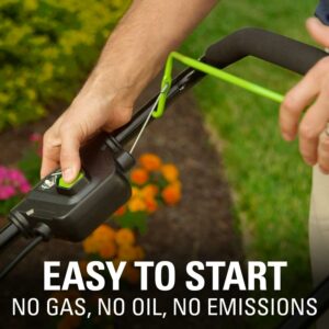 – This push lawn mower is virtually maintenance-free, with no gas, no oil, and no emissions. Push button start, quiet operation, and delivers gas-like performance