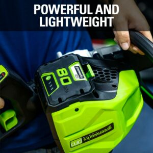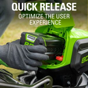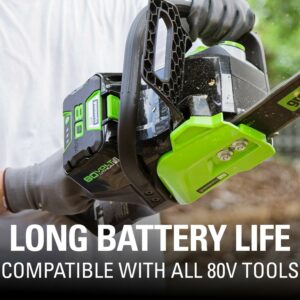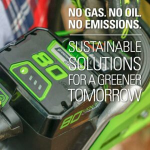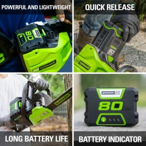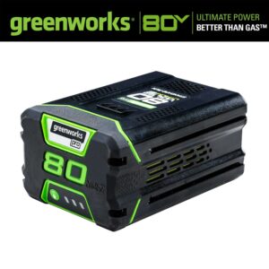 Greenworks 2901702. Features: High performance 80V Lithium-Ion battery delivers fade-free power with no memory loss after charging. On-board battery “fuel” indicator allows for on-demand reference of remaining power.. 100% charge in only 30 minutes.. Lighter weight power source compared to gas tanks makes it easier to use for extended period of time. Compatible with multiple tools and charger model GCH8040