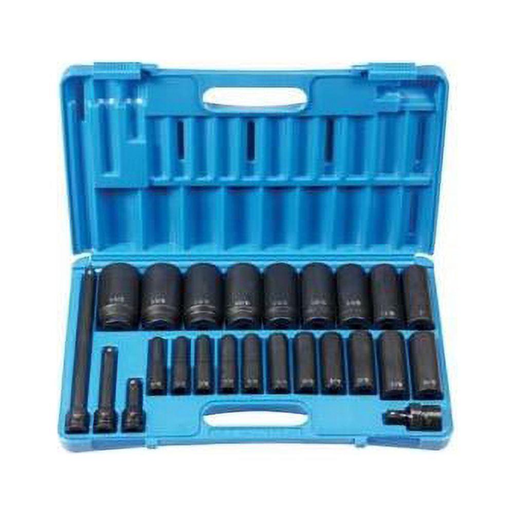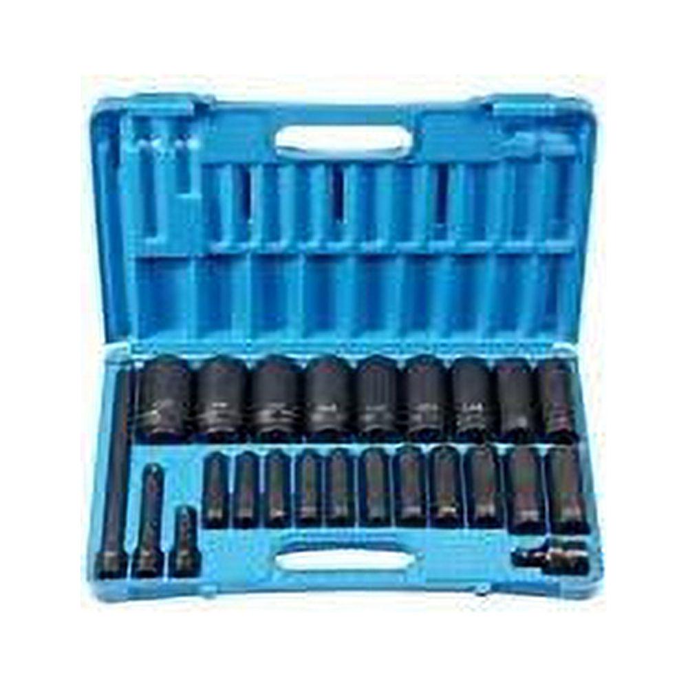 Good ratchet sets are only as good as your corresponding sockets. Offering deep length sizes, the 24-Piece 1/2 in. Drive Deep Socket Set accommodates your socketing needs. Made of high quality alloy steel and delivering high torque drive, these sockets combine increased strength and durability. The high torque drive of these sockets provides increased strength through the transfer of pressure from the thinnest part of the socket wall toward the thicker section. Designed for professional tool users, this set is applicable for tightening and loosening bolts, auto repair, and mechanical work. High quality alloy steel (chrome-molybdenum) construction with exact heat treatment ensures the correct balance of strength and durability High torque drive provides increased strength through the transfer of pressure from the thinnest part of the socket wall toward the thicker section A reduction in wall thickness increases socket’s capability of being used in tight areas Sockets grip the fastener across a broader contact area, reducing the chance of rounding off fasteners Molded case with handle allows easy storage and convenience while working 1/2 in. Drive 1/2 in. Friction Ball U-Joint – 2229UJ 1/2 in. Drive 10 in. Length Friction Ball Extension – 2210E 1/2 in. Drive 3 in. Length Friction Ball Extension – 2243E 1/2 in. Drive 5 in. Length Friction Ball Extension – 2245E Molded Storage Case 1/2 in. Drive 5/16 in. Deep Length Impact Socket – 2010D 1/2 in. Drive 3/8 in. Deep Length Impact Socket – 2012D 1/2 in. Drive 7/16 in. Deep Length Impact Socket – 2014D 1/2 in. Drive 1/2 in. Deep Length Impact Socket – 2016D 1/2 in. Drive 9/16 in. Deep Length Impact Socket – 2018D 1/2 in. Drive 5/8 in. Deep Length Impact Socket – 2020D 1/2 in. Drive 11/16 in. Deep Length Impact Socket – 2022D 1/2 in. Drive 3/4 in. Deep Length Impact Socket – 2024D 1/2 in. Drive 13/16 in. Deep Length Impact Socket – 2026D 1/2 in. Drive 7/8 in. Deep Length Impact Socket – 2028D 1/2 in. Drive 15/16 in. Deep Length Impact Socket – 2030D 1/2 in. Drive 1 in. Deep Length Impact Socket – 2032D 1/2 in. Drive 1-1/16 in. Deep Length Impact Socket – 2034D 1/2 in. Drive 1-1/8 in. Deep Length Impact Socket – 2036D 1/2 in. Drive 1-3/16 in. Deep Length Impact Socket – 2038D 1/2 in. Drive 1-1/4 in. Deep Length Impact Socket – 2040D 1/2 in. Drive 1-5/16 in. Deep Length Impact Socket – 2042D 1/2 in. Drive 1-3/8 in. Deep Length Impact Socket – 2044D 1/2 in. Drive 1-7/16 in. Deep Length Impact Socket – 2046D 1/2 in. Drive 1-1/2 in. Deep Length Impact Socket – 2048D