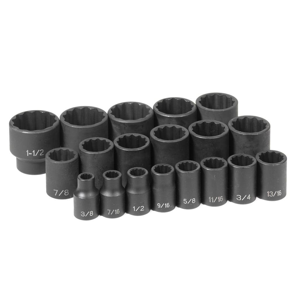 Made of high quality steel (chrome-molybdenum) Engineered specifically for use with impact tools, using the most up to date industrial specifications Made to transfer the pressure from the thinnest part of the socket wall toward the thicker section, resulting in increased strength Packaged in a molded storage case The impact socket set features high torque drives, which limits the amount of wear on the corners of the fastener and the socket Improves the strength of the socket, transfers increased torque to the fastener and allows easier access to tight areas Each socket is thoroughly made with the correct balance of strength and durability and is tested to the highest specifications to deliver outstanding performance at the most competitive cost Set contains the following sizes: 3/8″, 7/16″, 1/2″, 9/16″, 5/8″, 11/16″, 3/4″, 13/16″, 7/8″, 15/16″, 1″, 1-1/16″, 1-1/8″, 1-3/16″, 1-1/4″, 1-5/16″, 1-3/8″, 1-7/16″, and 1-1/2″ in standard length