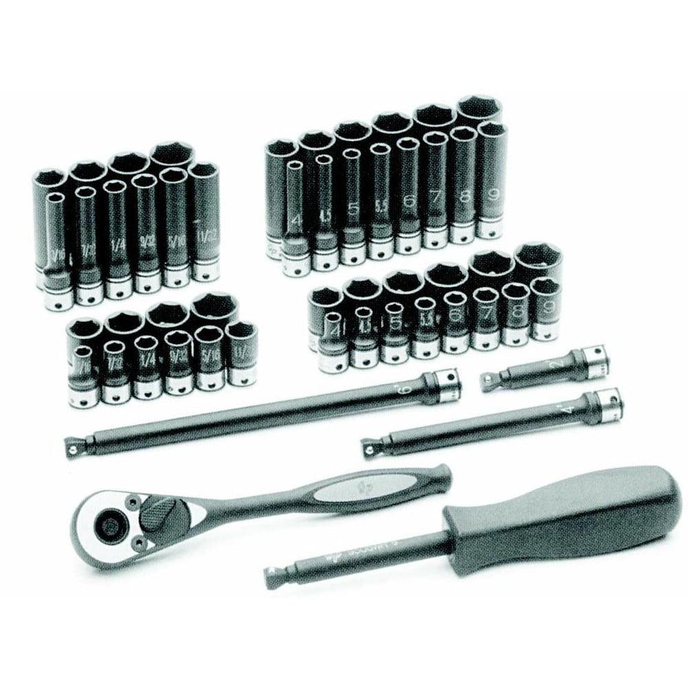 – Set contains all standard and deep length 6 point sockets in both fractional and metric sizes, plus a 72 tooth quick release ratchet, 3 extensions and a wobble spinner handle. Fractional sizes 3/16 to 9/16 and metric sizes 4mm to 15mm.