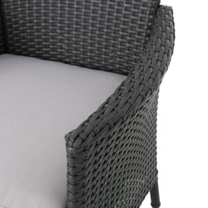 Includes: Two (2) chairs Materials: Resin wicker with metal frame Cushion material: Waterproof fabric Color: Grey Cushion color: Light grey Assembly required: Yes Weight: 14-pounds each Dimensions: 33 inches high x 22.50 inches wide x 25 inches deep Seat dimensions: 16 inches high x 18 inches wide x 18 inches deep Armrest dimensions: 23.75 inches high
