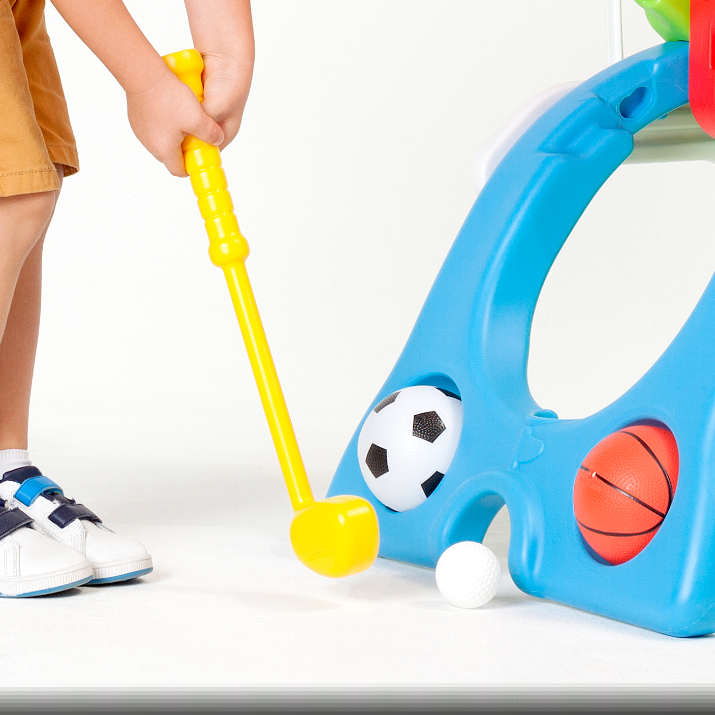 The Grow ‘N Up Quick Flip 6-in-1 Sport Activity Center features an innovative design that includes basketball, soccer, baseball, golf, T-Ball, and slide play. This unique sports center is the right size for toddlers and a great way to build coordination, balance, gross motor skills and cognitive development. This Set features bright colors in Reds, Blues, Greens and Yellow and the set is UV Protected to prevent fading. The Compact size makes it easy to place both indoor outdoor. The 6 N 1 Center folds flat for easy transport and storage. The Center includes a Golf club, golf ball, basketball, baseball bat, baseball and three play balls are included. Easy Adult Assembly is required. The Recommended Ages are 1.5 Years to 4 Years.