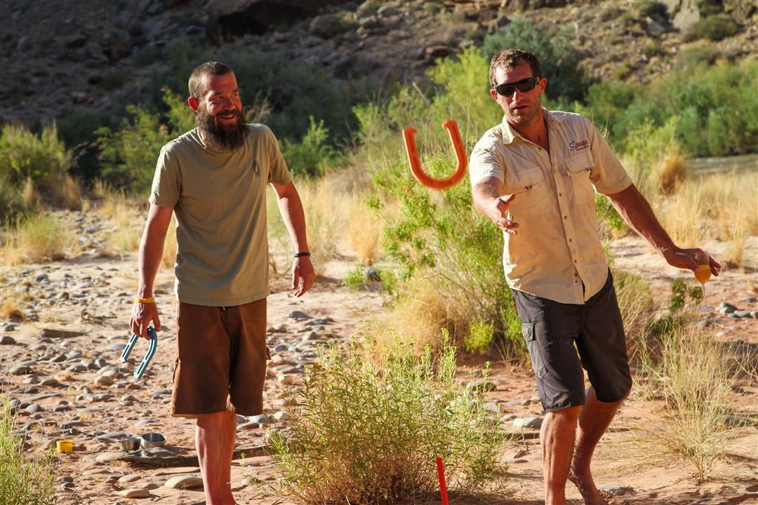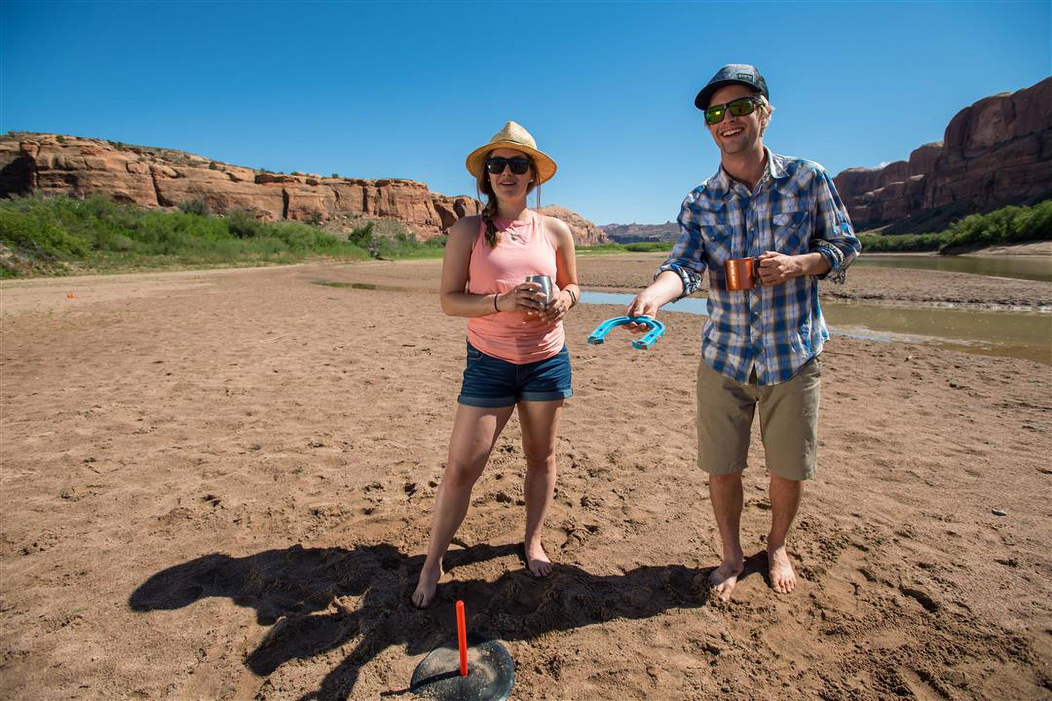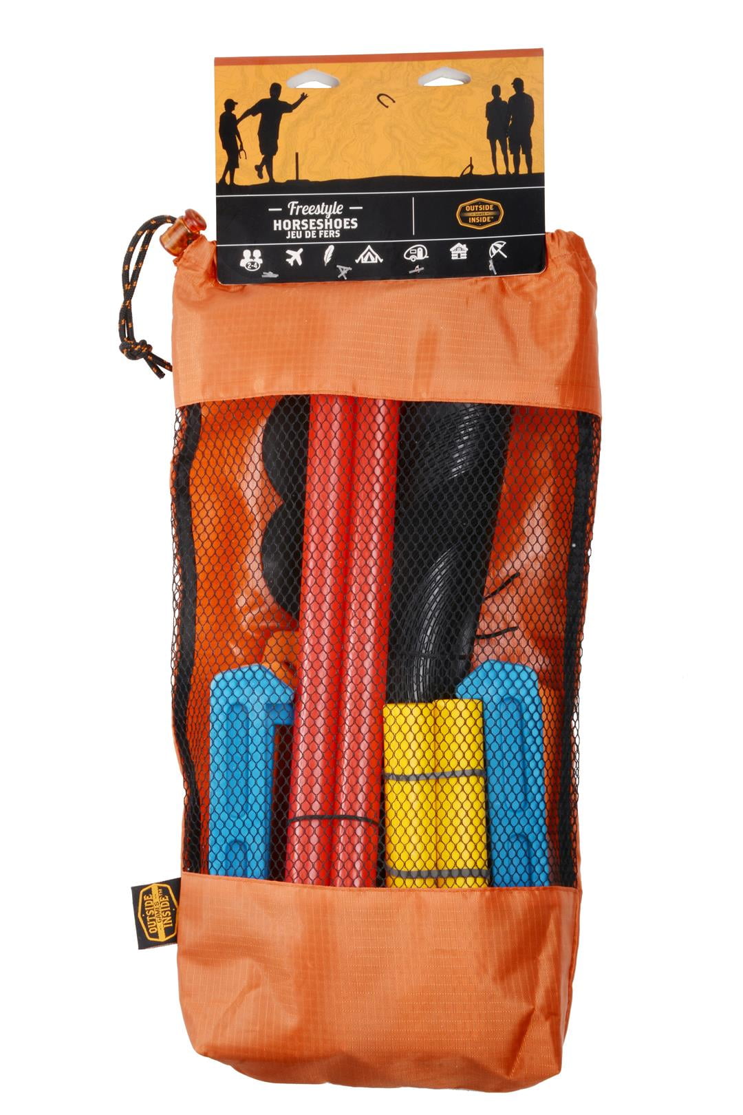 A pitching game of skill and strategy. Ring the horseshoes around the post for points. Play indoors or out. Lightweight and packable. Set includes: Four full size rubber horseshoes, two rubber mats, two indoor stakes, two outdoor stakes, instructions and carry bag.