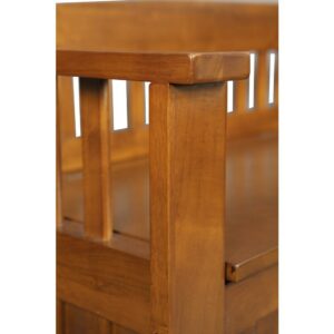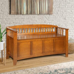 Locking storage for five long guns. Removable accessory tray for handguns or other accessories. Attractive slat design. Felt lined barrel rest. Warranty : 90 days limited. Made from wood and veneer. Medium cherry finish. No assembly Required. Seat: 48.5 in. W x 15.75 in. D. 54 in. L x 17 in. W x 30.5 in. H (95 lbs.). This entryway bench is both attractive and multi functional.