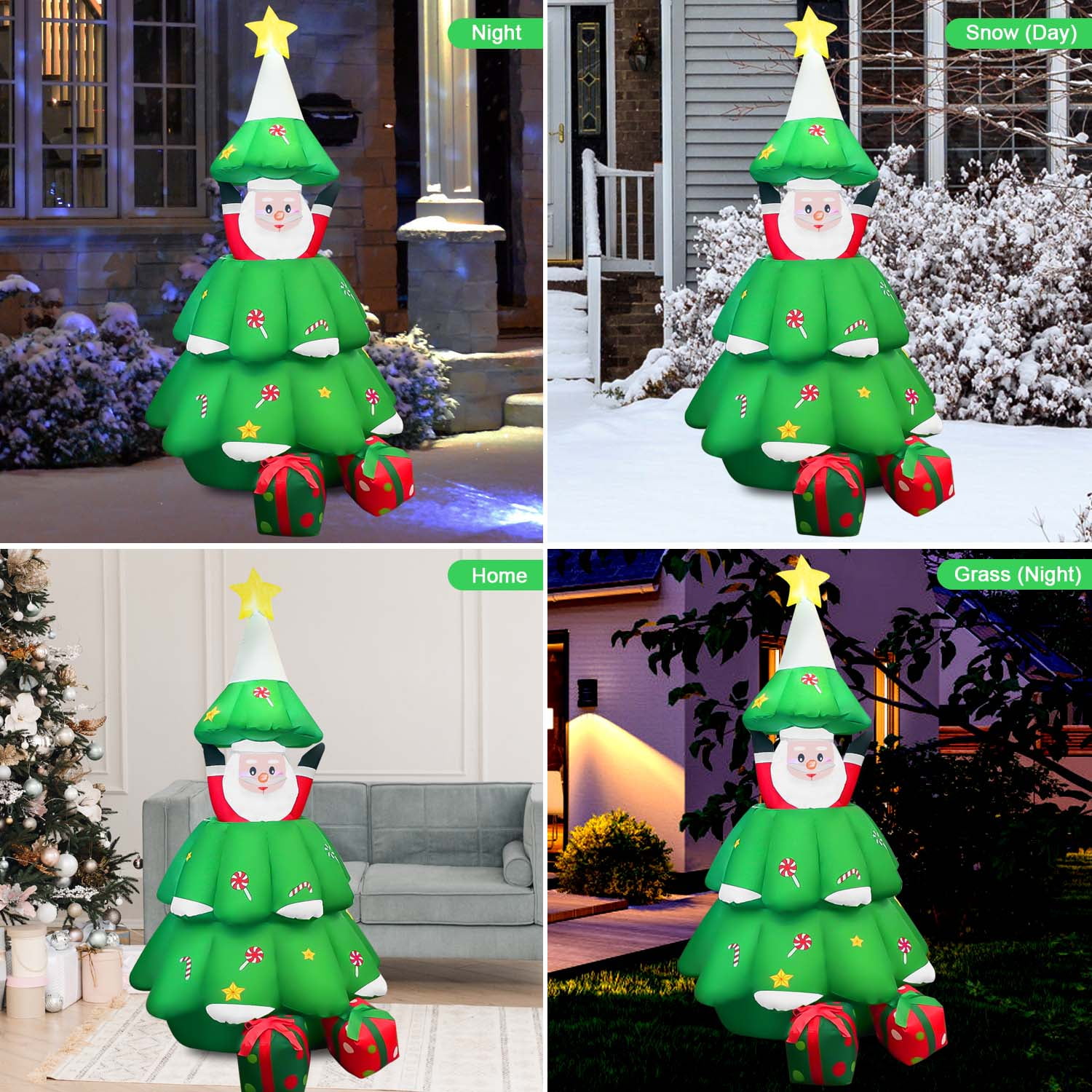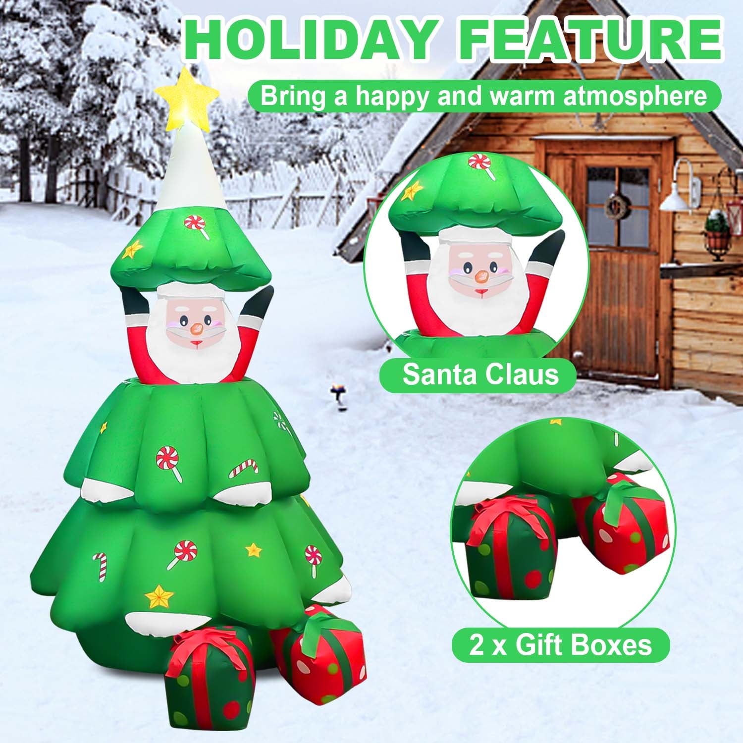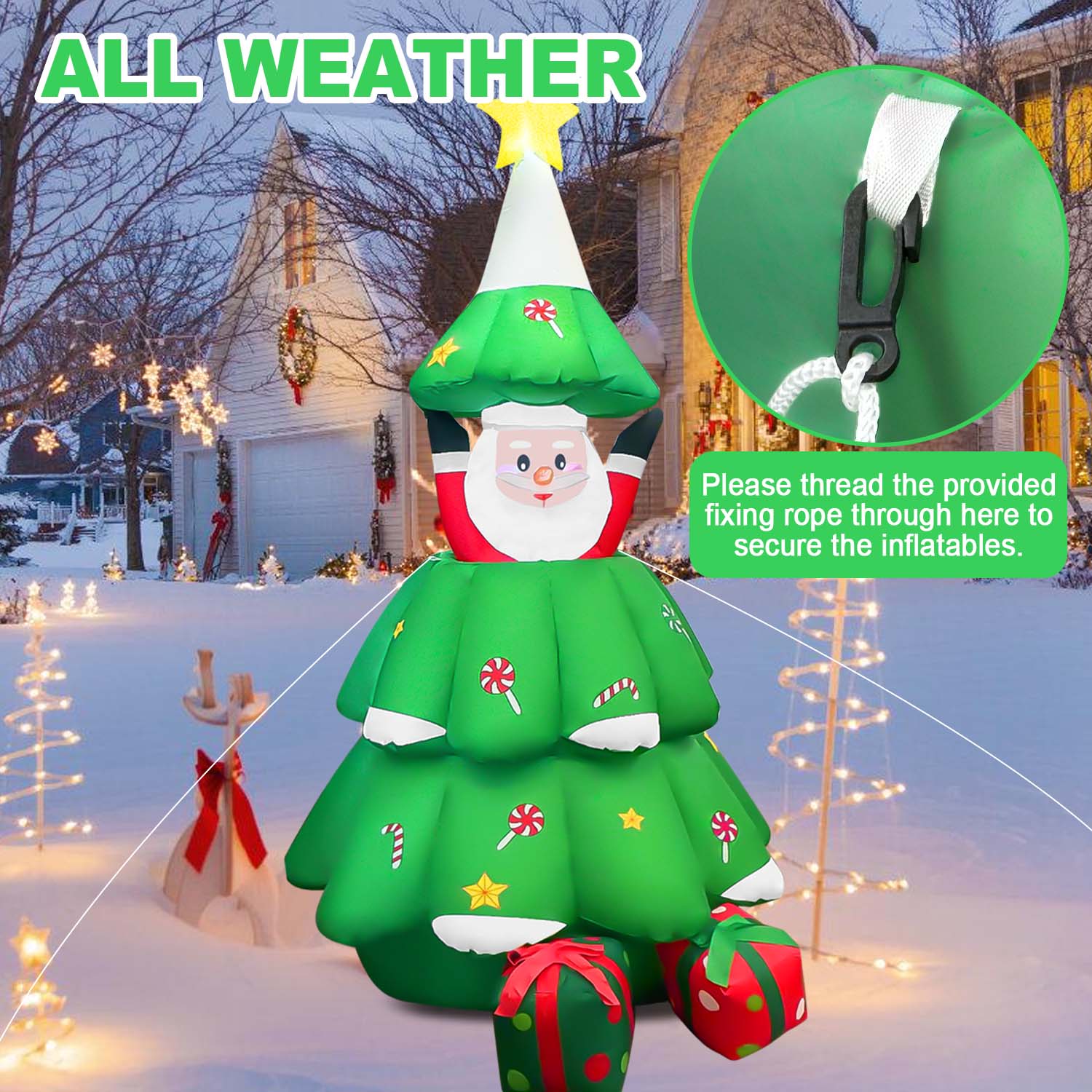 EXCELLENT FESTIVAL DECORATION – Comes with interior LED lights to bring some happy atmosphere to your neighbors, friends, and family for extra holiday cheer; The flashing lights make the Christmas decoration look more realistic to enhance festival features. FAST INFLATION & DEFLATION – This eye-catching decoration requires minimal effort to set up in a few minutes with the built-in fan and charger; Don?t worry about the storage problem, the considerate design allows people to store it quickly and easily with the included carrying bag. HUMANIZED DESIGN – Made of high-quality polyester material, this Santa ornament is safe and durable to use; The extended power cord is suitable for you to put it in different places, no matter indoor or outdoor, such as the garden, lawn, backyard, courtyard, patio, and so on; Featuring low noise, our product only makes a little noise when operating in the room; If placed outdoors, the noise can be neglected. HOLIDAY FEATURE – Santa Claus keeps hidden in a Christmas tree with around gift boxes and wants to surprise everyone, which gives your garden a joyful holiday vibe; Creating a fun and memorable scene in your house or on your lawn during the holiday season; There are tethers on both sides of the product, keeping it secure to the ground. ACCESSORY KIT – The package includes 4 ground stakes, 2 ropes, and built-in sandbags to make it more stable outside even in windy weather; Just plug it in, stake it down and watch it transform; A perfect nighttime display will make your house become more popular and unique on Christmas.
