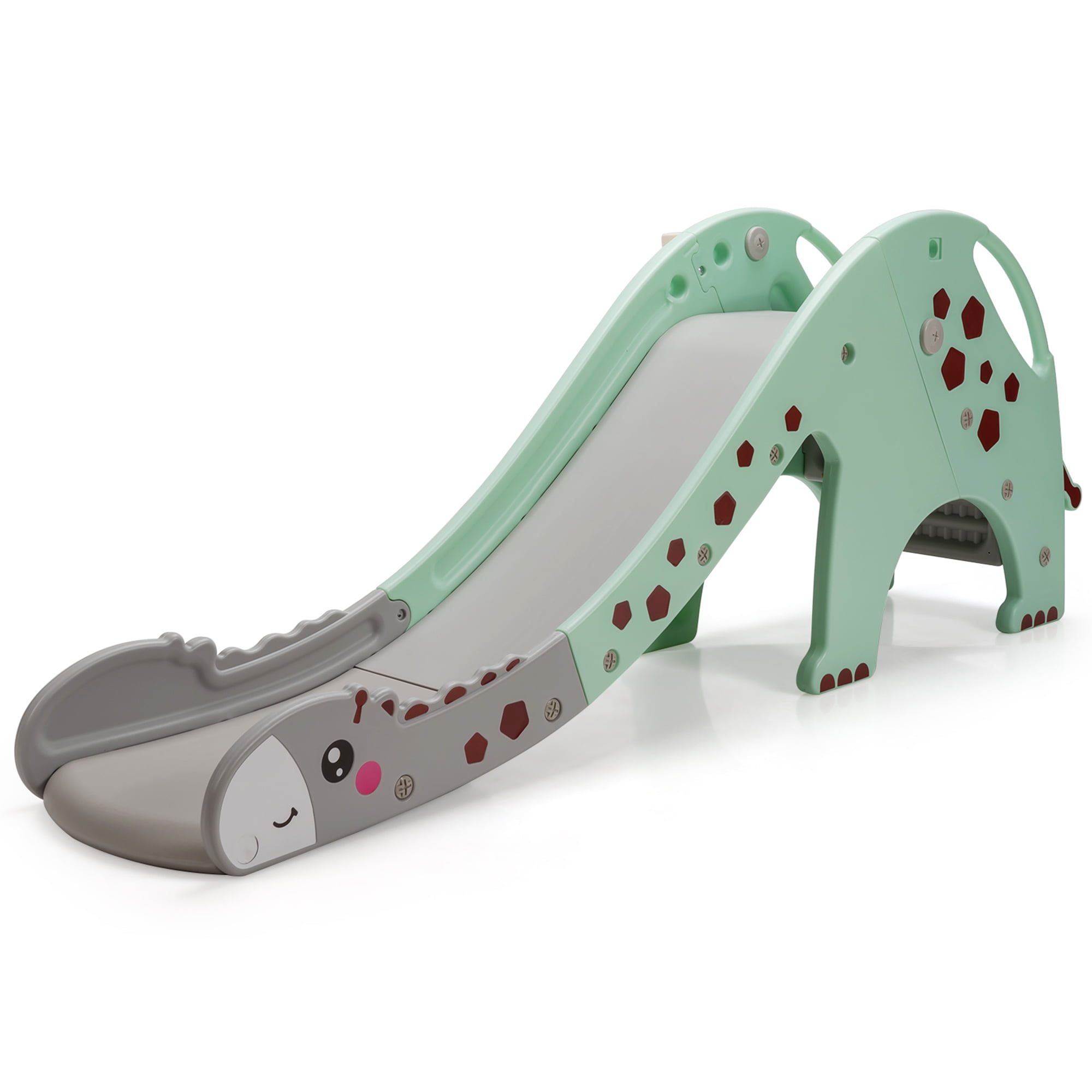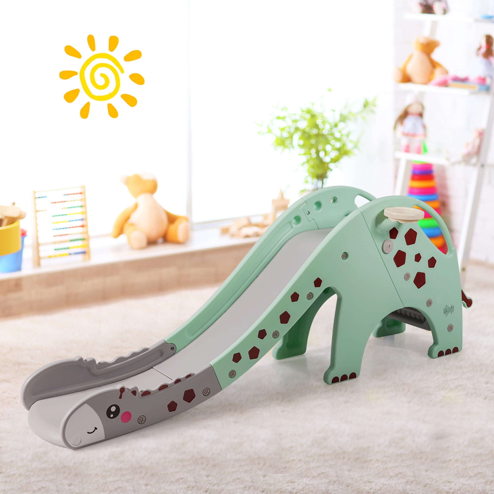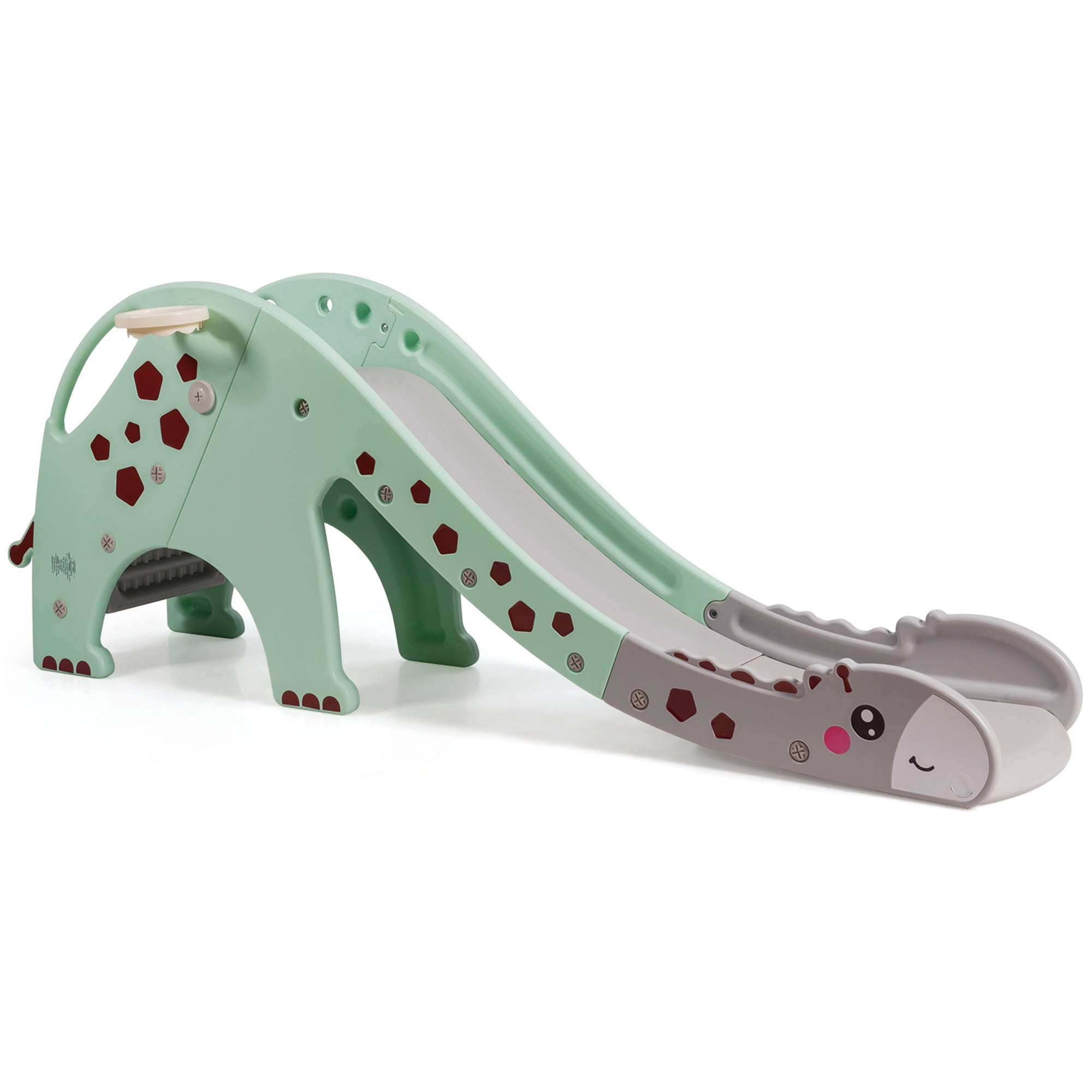 Description: This slide is perfect for kids having fun both indoor and outdoor. The bright and lovely appearance will attract children’s attention at once. With a basket hoop for children to shoot, it increases the fun of play and develops the child’s athletic ability. Made of non-toxic and durable HDPE, it is not easy to wear and deform, allowing children to play without worry. In addition, the sturdy and stable structure gives it a strong load-bearing capacity. Raised armrest design ensures your child’s safety during climbing and sliding. Smooth slide way and burr-free round corners protect your child’s delicate skin. This is an excellent toy for your child. Don’t hesitate take it home! Features: Raised guardrail and non-slip ladder increase the safety factor of slide Enhance the kids’ motor nerve and physical development abilities Specification: Color: Green Material: HDPE Overall Size: 75” x 22” x 28” (L x W x H) Slide Size: 53” x 15” (L x W) Net Weight: 19 lbs Weight Capacity: 110 lbs Recommended Age: 1-6 years old Package includes: 1 x Giraffe Slide 1 x Ball 1 x Instruction