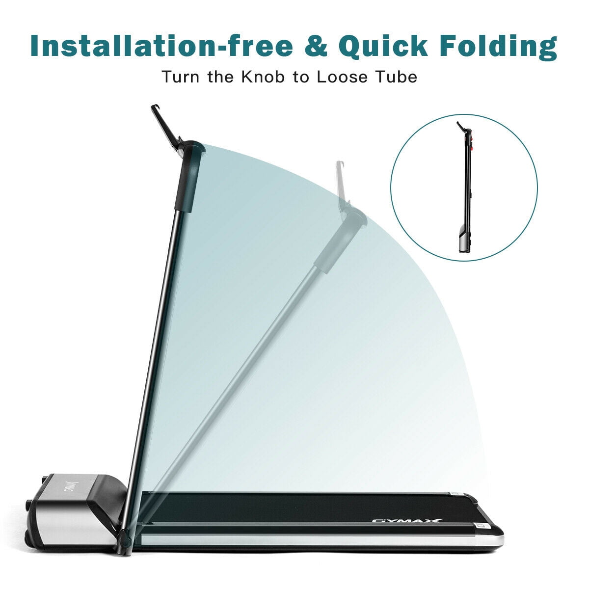 Description: Our foldable treadmill with spacious running belt could provide effective workout space for you. It is great for walking, jogging and running, helping to boost your aerobic capacity and burn more calories. Designed for home use, it features a compact and ultra-thin design for easy storage. With a non-slip and shock-absorbing running belt, it will effectively reduce the impact in running and protect your knees. The easy-to-operate LED display helps regulate speed, distance, time and calories burned to meet your different fitness goals. In addition, the safety key ensures that you stop running immediately in an emergency. Start exercising now and have a healthy body easily! Suitable for walking, jogging, running and personal training Compact, ultra-thin and foldable design saves space for home and office use Shock-absorbing and non-slip rubber running belt reduces motion shock Power cord with UL certification Specification: Material: Iron Tubes and ABS Shell Color: Black, Silver Overall Dimension: 52” x 26” x 47.5” (L x W x H) Folded Size: 26”x 5”x 53.5” (L x W x H) Dimension of Belt: 15.5” x 40.5” Net Weight: 61 lbs Weigh Capacity: 220lbs Motor: 450W DC Rated Voltage: 110V Speed Range: 0.5Mph to 5Mph Package Included: 1 x Folding Treadmill 1 x Tablet PC/Phone Holder 1 x Safety Key 1 x Power Cord 1 x Instruction