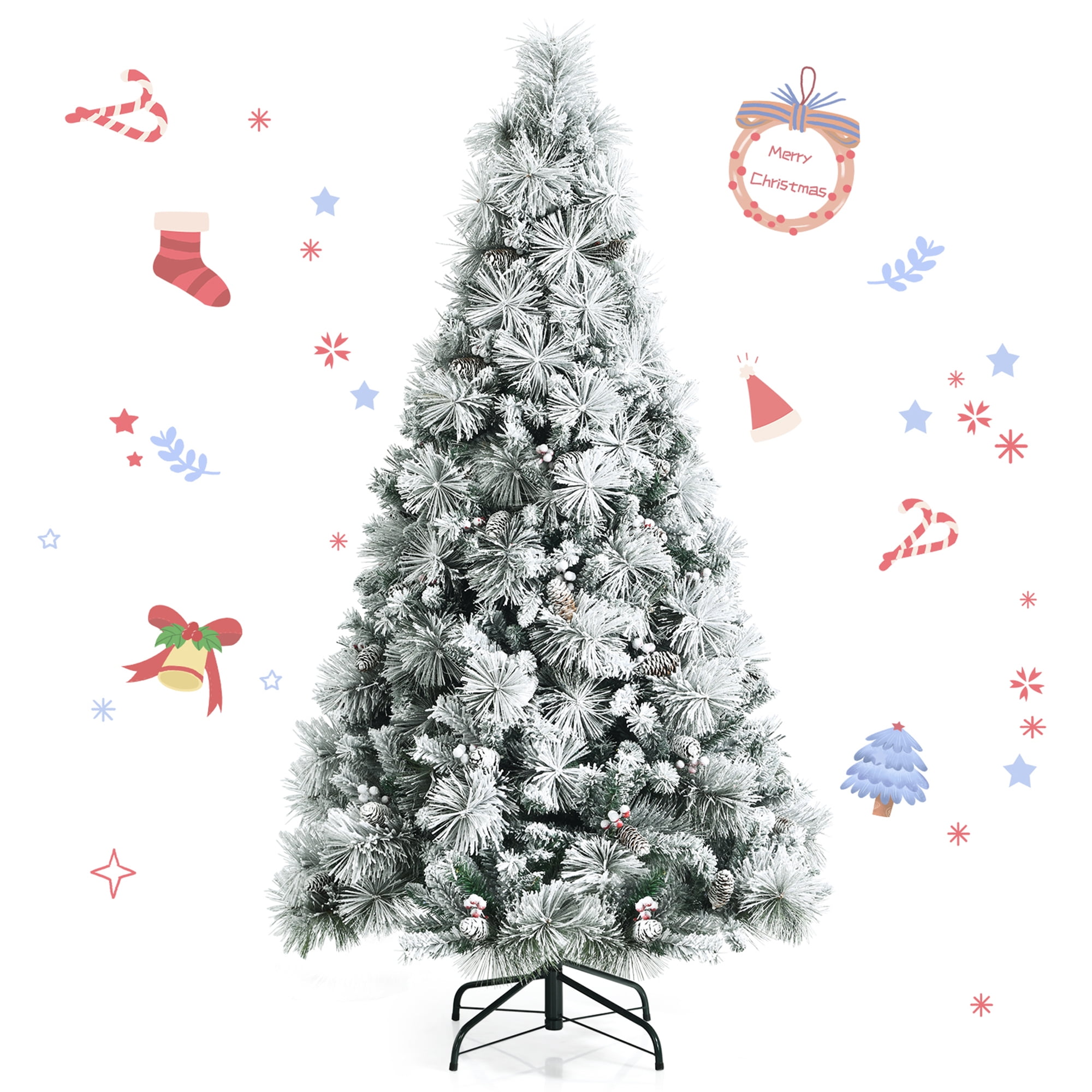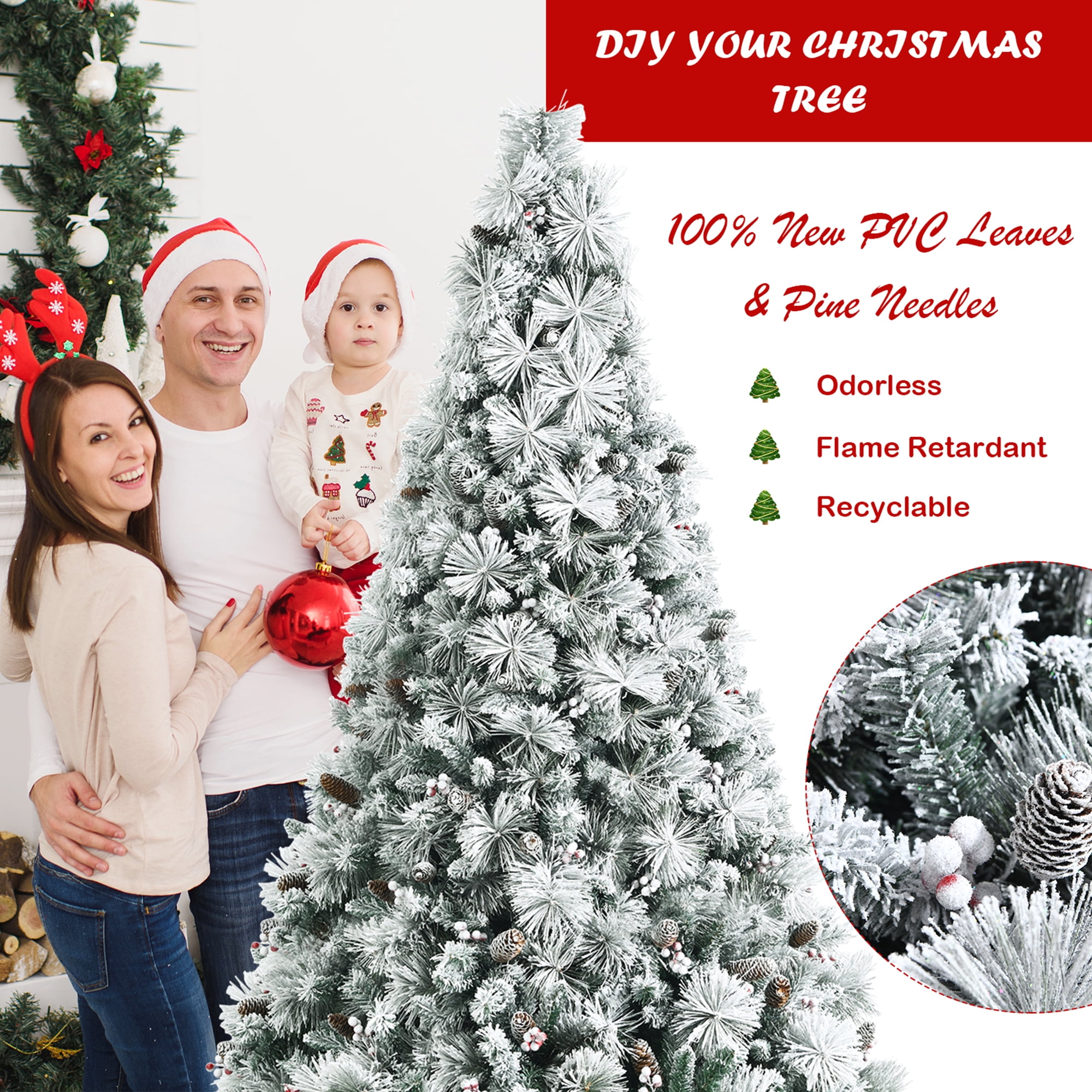 Description: Here comes a beautiful snow flocked Christmas tree, which can bring warmth and vitality to your home. With 652 branch tips, the shape of the tree is rather full and lush. And all leaves are made of 100% new PVC, which has a brighter color than recycled material. Sprayed with white powder, the snow flocked tree looks as natural as a real pine tree grown in snowy winter. Trimmed with classic pine cones and red berry clusters, this tree is full of festive feeling and will be attractive. Except home, you can also place it to decorate office, party, trade activities, for it can create a Christmas atmosphere for you. The hinged branches and separated sections provide convenience for setup and storage. Get one Xmas tree to decorate your home! Features: Natural snow flocked appearance gives you good visual experience Classic pine cones and red berries create festive atmosphere Hinged design for easy fluff and assemble Specification: Color: Green Material: New PVC, Metal Height: 6 FT Width: 3.4 FT Net Weight: 22 lbs Number of Tips: 652 Number of Sections: 3 Package includes: 1 x Snow Flocked Christmas Tree 1 x Metal Stand