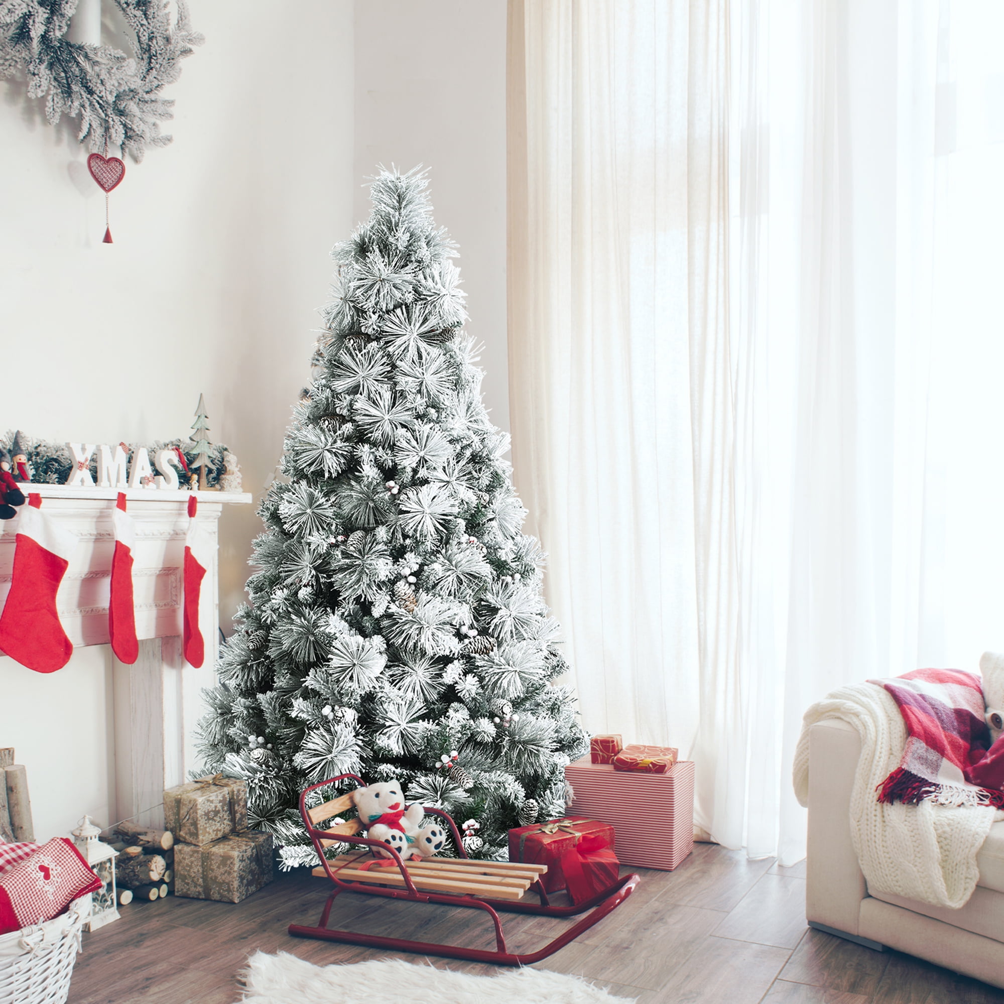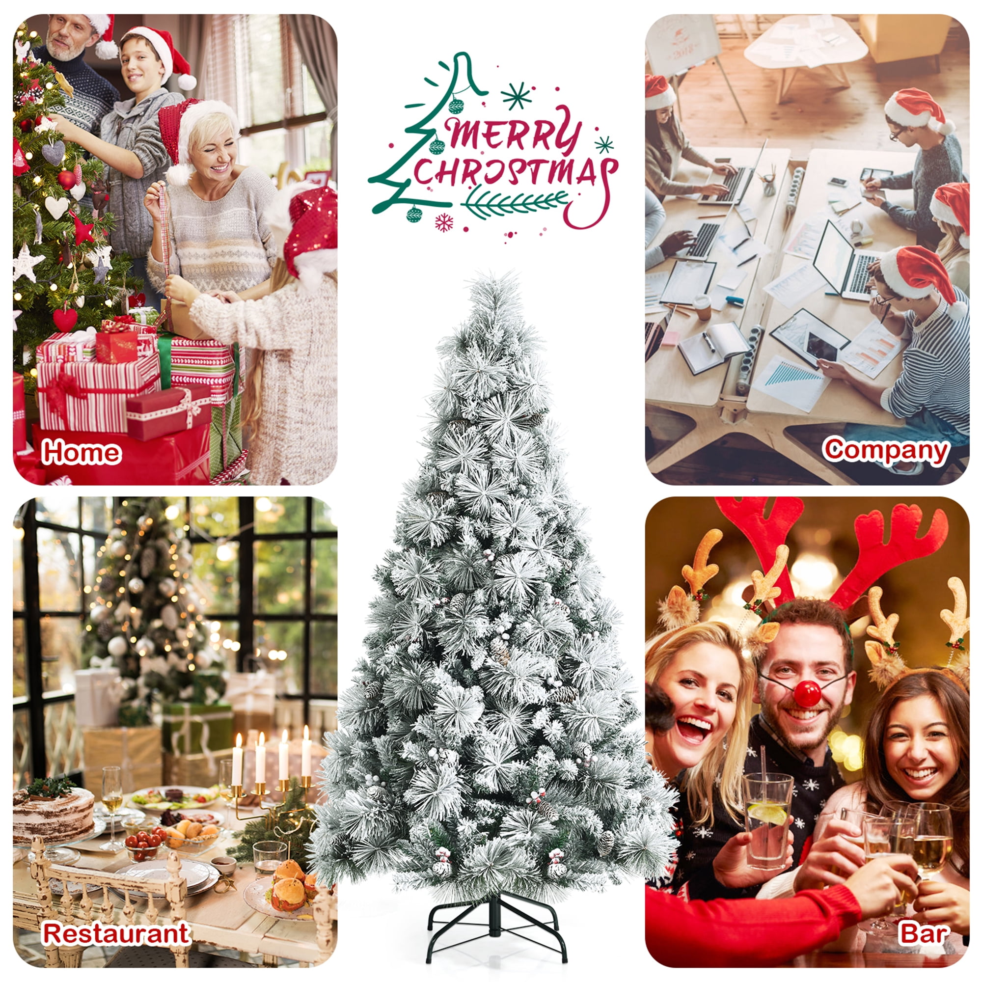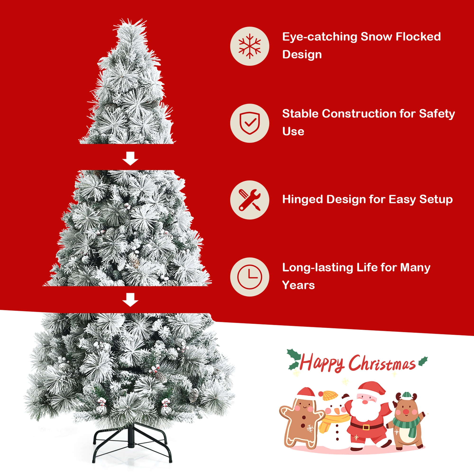A Nice Decoration: With classic Christmas elements such as red berry clusters and pine cones, this snow flocked Christmas tree is attractive and full of festive feeling. Meanwhile, you can also put extra ornaments prepared by yourself on it to make it more beautiful. Decorate your home, party, trade activities and so on with the tree to build a warm atmosphere. Fluffy & Vivid Appearance: With 652 branch tips, this Christmas tree looks dense and full in appearance, providing a lively atmosphere for you. The leaves and pine needles are individually crafted aiming to make it close to a real tree. The snow flocked tree accurately catch the elegance and charm of winter, giving you good visual and festive experience. Superb PVC Material: Its branch tips are made of 100% new PVC, which is not easy to age or fade, thus this tree can keep its beautiful appearance for a long time. Besides, this material is flame-retardant, which greatly reduce the risk of catching fire. And all the branch tips are connected firmly, so you needn’t to worry about that it may fall off. Heavy-Duty Metal Base: The heavy-duty metal base is very sturdy. Connect the tree sections to the stand with 3 screws to ensure tree’s stability. Compared with fragile plastic base, our base is durable enough to prevent unexpected cracks. Therefore, the tree can always stand firmly even with lots of ornaments on it. Simple Assembly & Storage: The Christmas tree is divided into 3 sections, which is convenient for storage and setup. The sections can be put together in minutes. With hinged branches, the branches can be expanded fast, and its fluffing won’t take you too much time. Odorless and flame-retardant PVC material guarantees its long lifetime and safe using Except home decoration, you can also use it to decorate office, party and so on Lush shape makes it attractive and can bring warmth and vitality to your home Solid metal base with screws ensures it stand firmly without wobbling Easy assembly and storage for convenient using