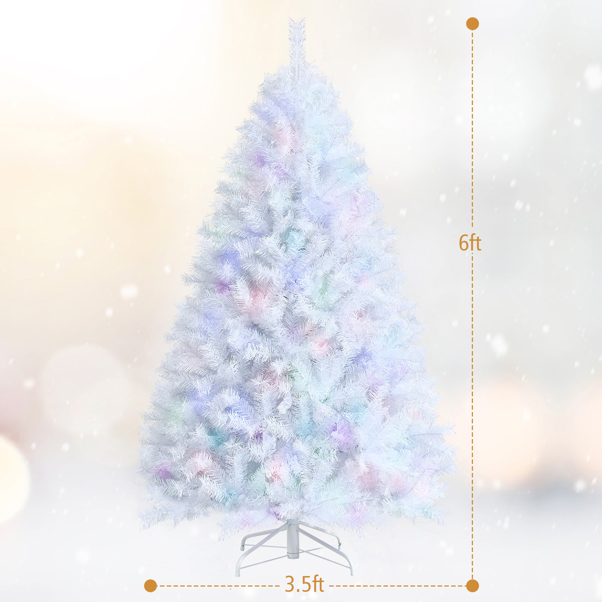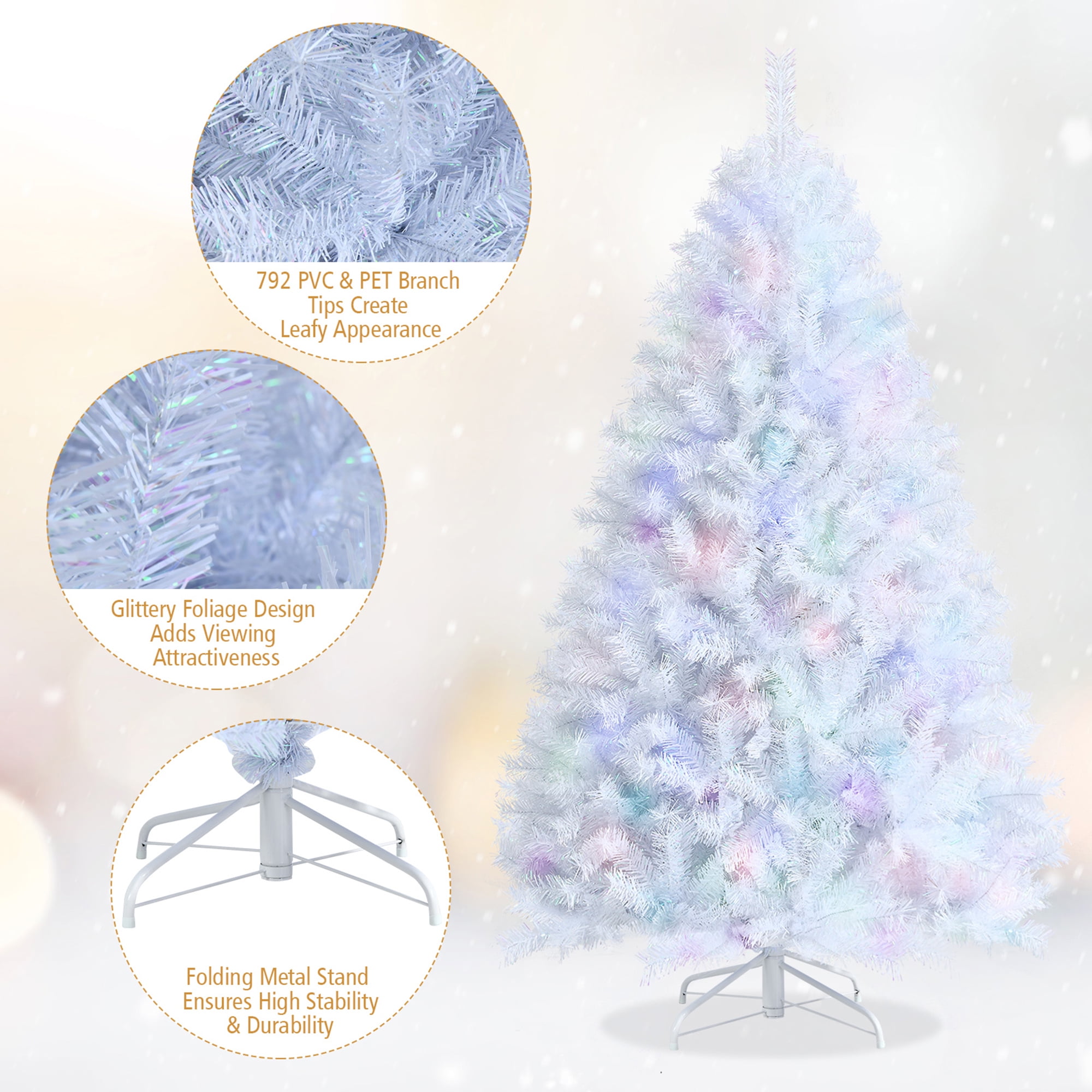 Simplistic Treewith Iridescent Tips: This white artificial Christmas tree that comes with 792 iridescent tips has visual attractiveness, though there are no extra holiday decorations hanging on the branches. So you can exert your imagination to decorate the tree with family, making it more meaningful and impressive. Premium PVC & PET Material: Adopted with premium PVC and PET material, this artificial Christmas tree has life-like leaves with glittery design. Also, all branch tips with strong adhesion are hard to fade or fall, making the tree suitable for indoor long-term use. Easy Set-Up & Fluffing: This realistic Xmas tree is divided into 3 hinged sections, allowing you easy to assemble by putting them together. Since all branches can automatically open, you don’t need to spend more time and energy on fluffing. Enhanced Metal Stand with Folding Design: Supported by heavy-duty metal stand, the tree ensures high stability and upright position. And the large x-shaped base with non-slip pads protects the floor from scratching. Also, its folding design helps you to store and dismantle effortlessly. Perfect Decoration for Christmas: This beautiful Christmas tree can perfectly match with various occasions, such as shopping mall, cafe and school. The artificial Xmas tree contains sincere wishes and holiday luck, hoping you have a peaceful and happy time. Eye-catching Xmas tree fits festival celebration & party decoration Folding metal stands supports tree stably & makes storage easier Hinged branches can drop to the designed place automatically Simplistic style & pure color provide uniqueness and vividness