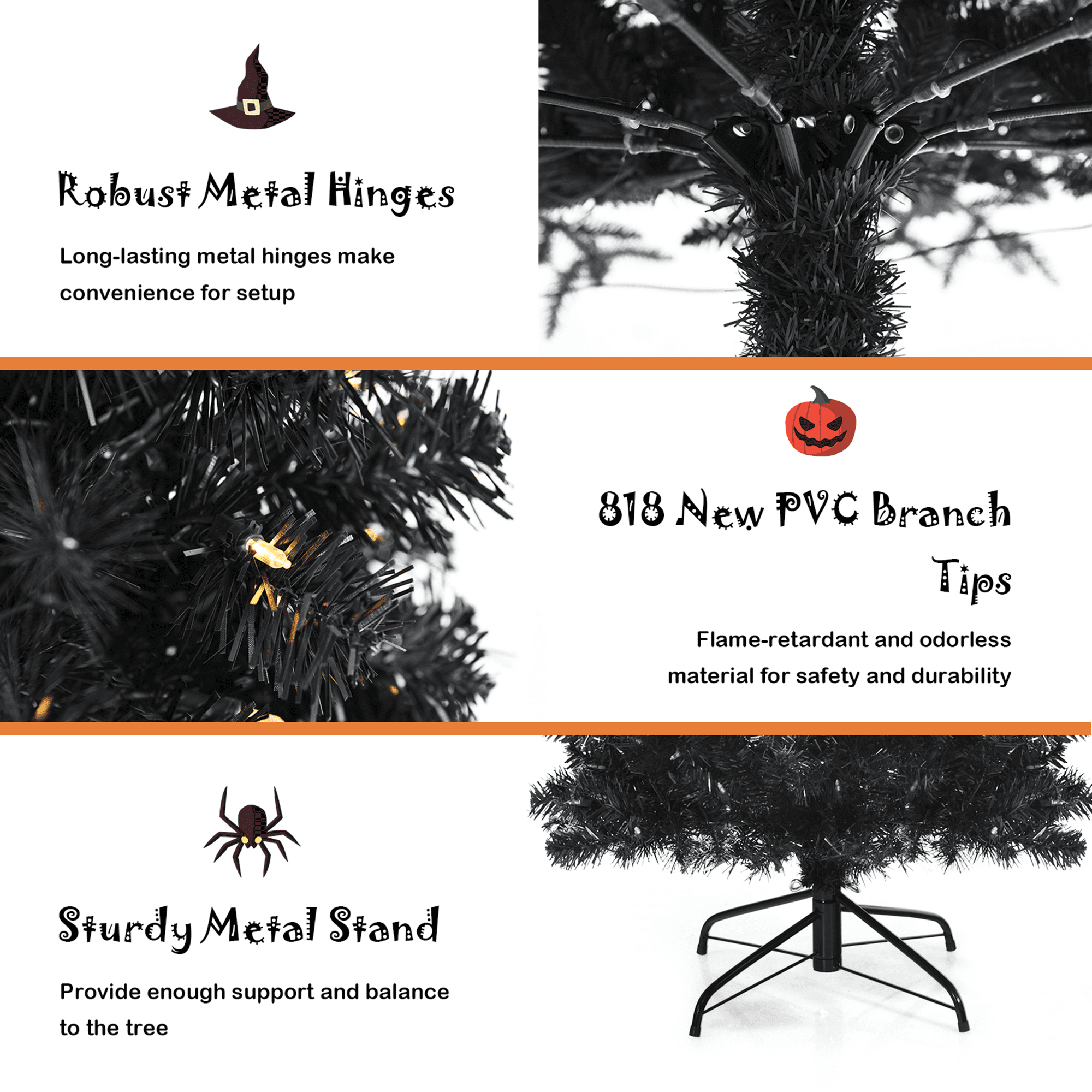 Gymax 6 FT Pre-lit Black Halloween Tree Artificial Hinged Christmas Tree
