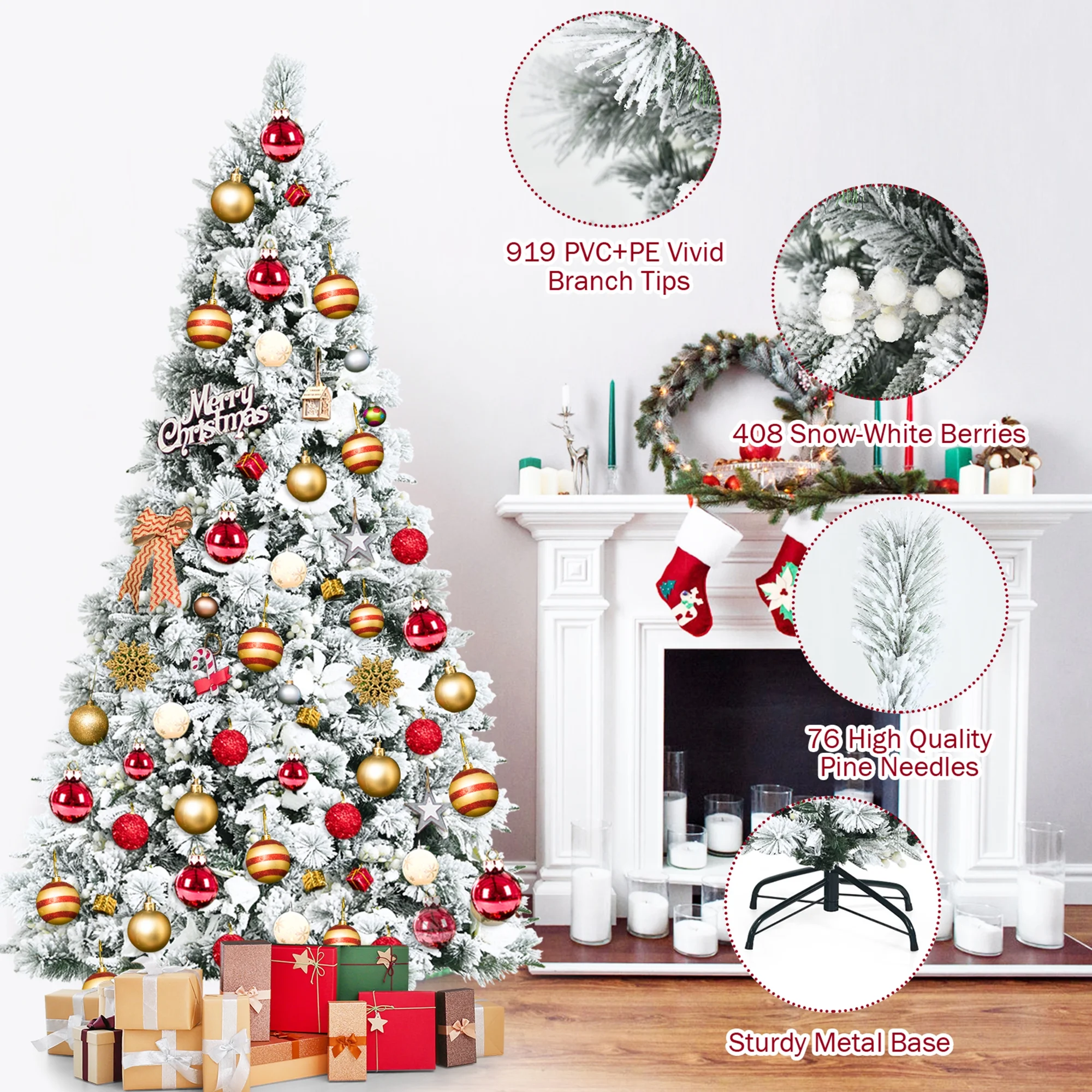 Lifelike Snow-Flocked Appearance: The 7FT artificial Christmas tree is a simulated tree with more than 919 branch tips with heavily flocked snow, creating a lush and natural appearance to your holiday display. Time-Tested PVC Material: Made of fire-retardant and non-allergic PVC & PE materials, the needles are environment-friendly and harmless to your body. Combining superior materials and exquisite craftsmanship, the tree looks more real and more beautiful. Flexible Branches with Hinge: 3-section assembly and hinged branches guarantee a quick and simple setup to get a flourishing and full Christmas tree. It is fairly easy for anyone to assemble that just straighten out the branches then the tree will achieve the best effect. Reliable Solid Metal Stand: This artificial tree stand comes with a cross-shaped metal stand, protecting your Christmas tree from tip over. With the foldable design, you can easily cover the tree using a tree skirt. Eye-Catching Appearance for Indoor Decor: Exquisitely decorated with 408 pure white berries and plenty of big white flowers, the Christmas tree is perfect for your indoor decorations. You can place it in the living room, school, office, or somewhere else. A cross-shaped metal stand provides strong support Easy to assemble and store with the hinged design