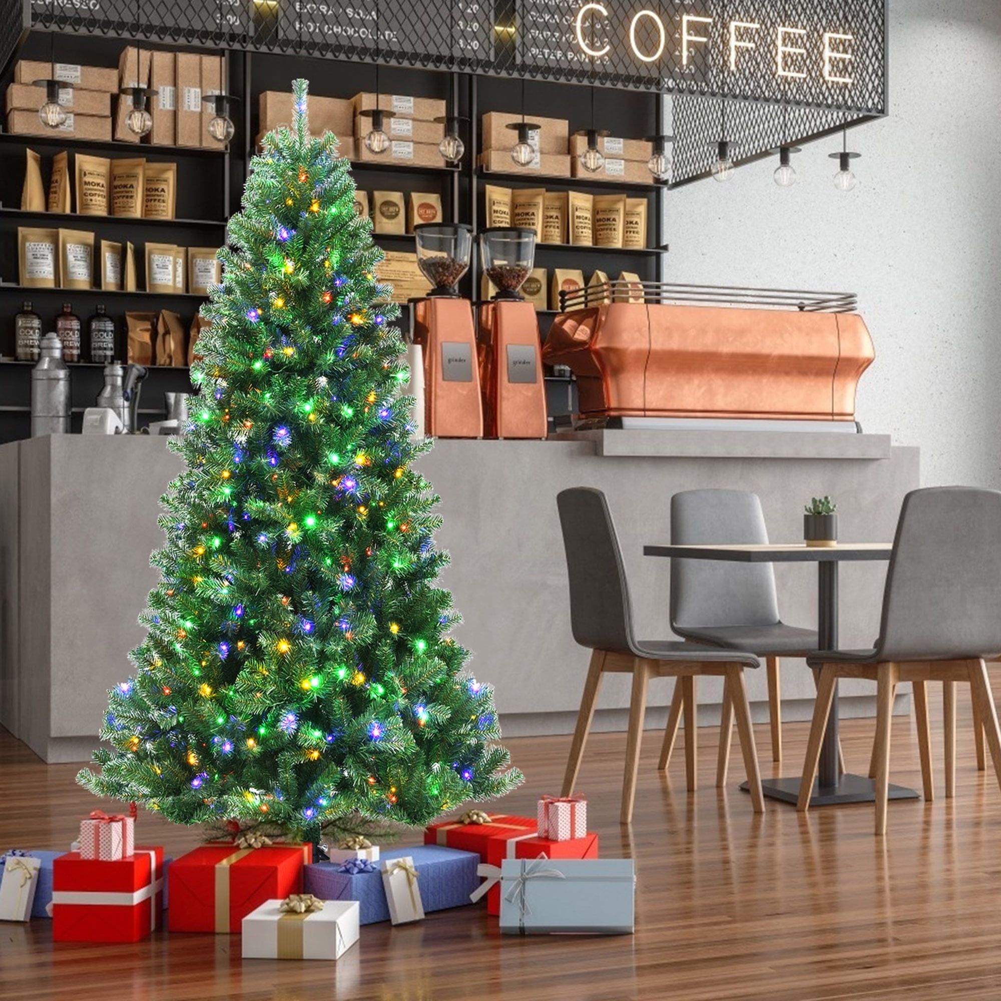 Description: Would you like to celebrate the coming Christmas with a different feeling? Our pre-lit Christmas tree with 9 lighting modes and 4 colors can create different party atmospheres, such as warm atmosphere and spooky atmosphere. With 1181 individually crafted branch tips, the tree looks dense and full, just as natural as a real tree. Made of 100% new PVC, these branch tips are strong enough to bear extra ornaments as many as possible. When the night is coming, turn on the lights and set your preferred lighting modes through remote controller. The installation of the tree is also time-saving. You can enjoy the beauty of the tree as soon as possible with the help of hinged branches. Features: Made of 100% new PVC, the branch tips are odorless, nonflammable and non-allergic 9 lighting modes and 4 changing colors could create different party atmospheres Hinged branches is time-saving for expanding and fluffing Specification: Color: Green Material: New PVC, Metal Overall Dimensions: 7′ x 3.7′ (H X D) Net Weight: 23 lbs Number of Lights: 500 Number of Tips: 1181 Number of Sections: 3 Package Includes: 1 X Pre-lit Christmas Tree 1 X Remote Controller 1 X Metal Stand